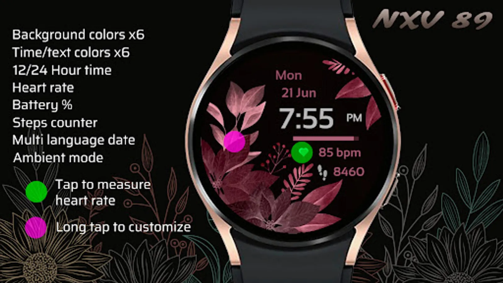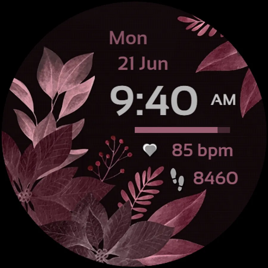 Elegant, stylish and colorful ladies watch face with the following features:• 6 background color customization options (long tap watch face to customize)