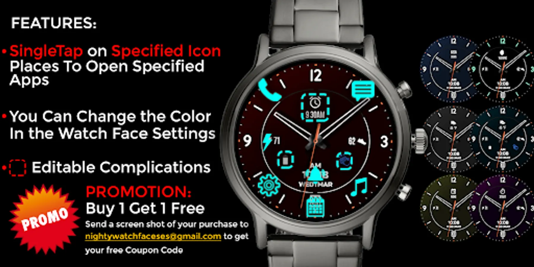 Send a screenshot of your purchase to nightywatchfaces@gmail.com to get your free promo code