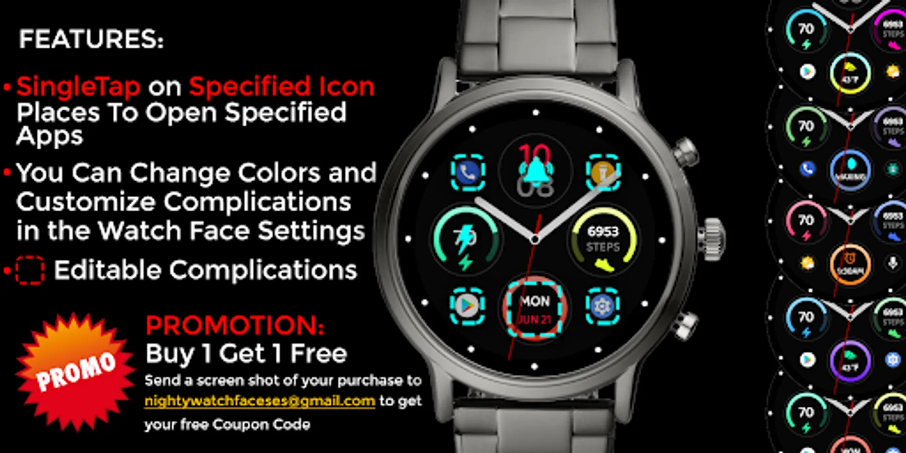 Send a screenshot of your purchase to nightywatchfaces@gmail.com to get your free promo code