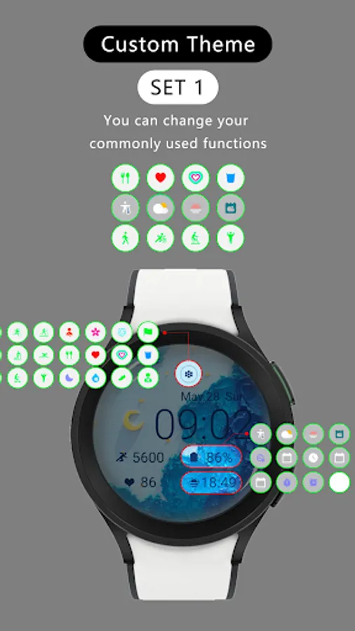 SET 1: Button 1, customizable basic, Samsung health, and sports functions