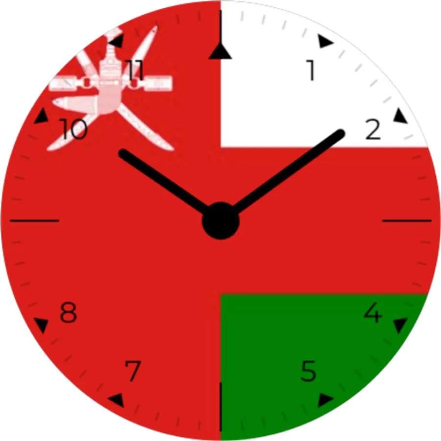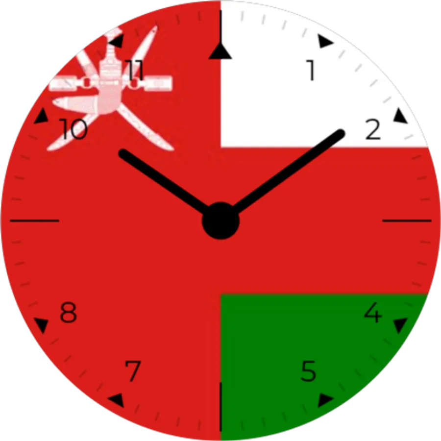 Analog watch face with Oman flag in background. Show the pride in your nation with a sleek, modern watch face with your countries national flag. Always on display simple white on black for longer battery life.