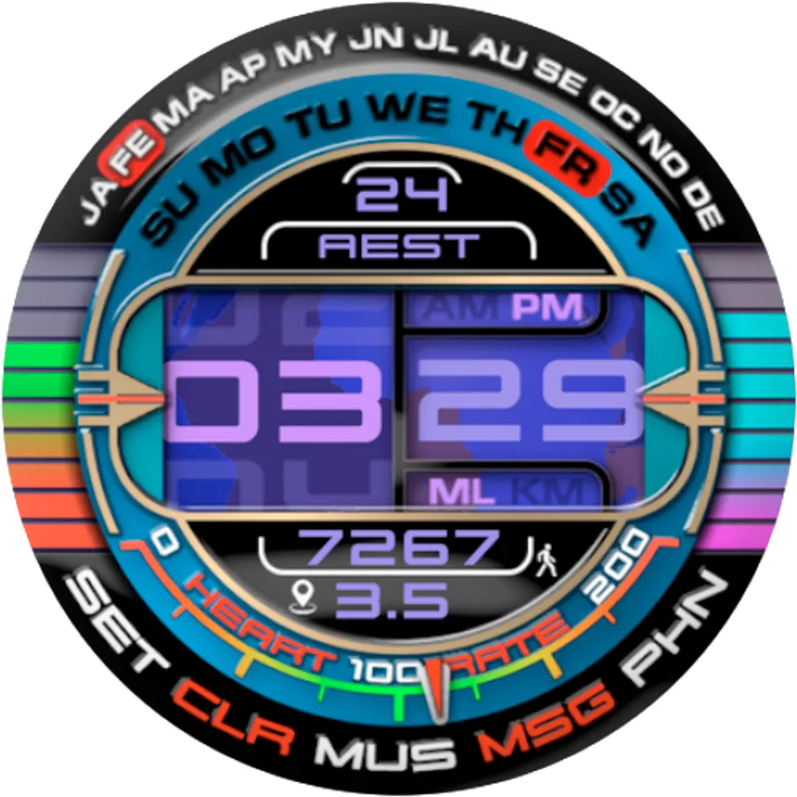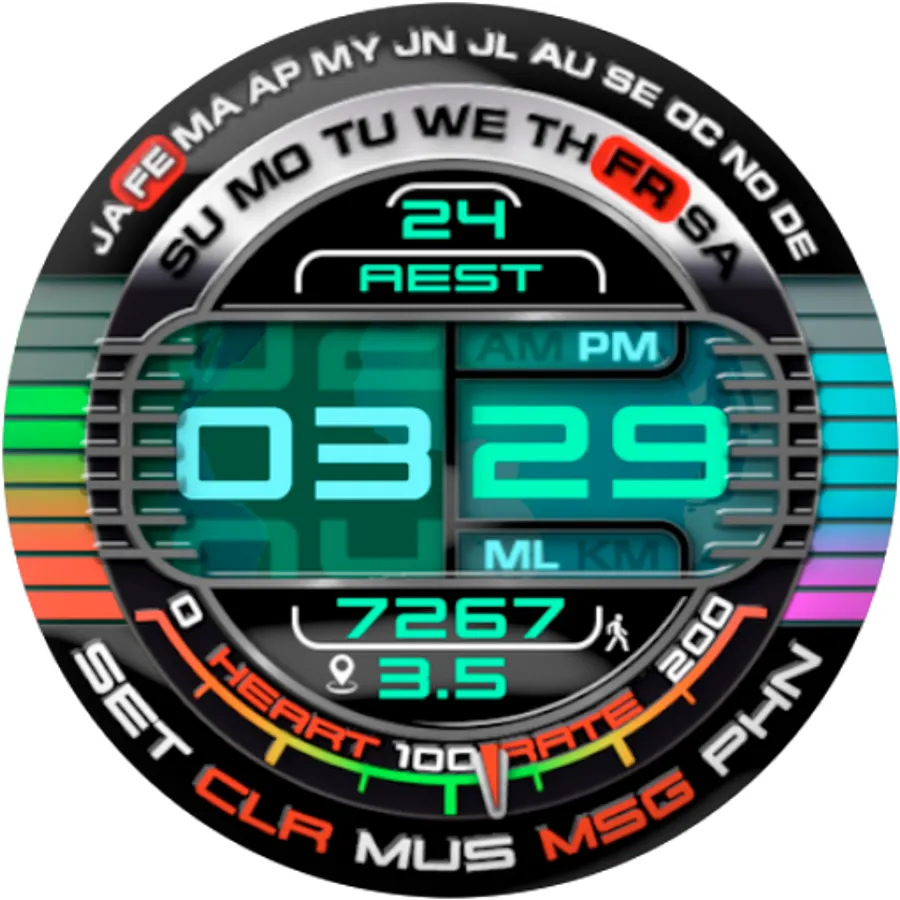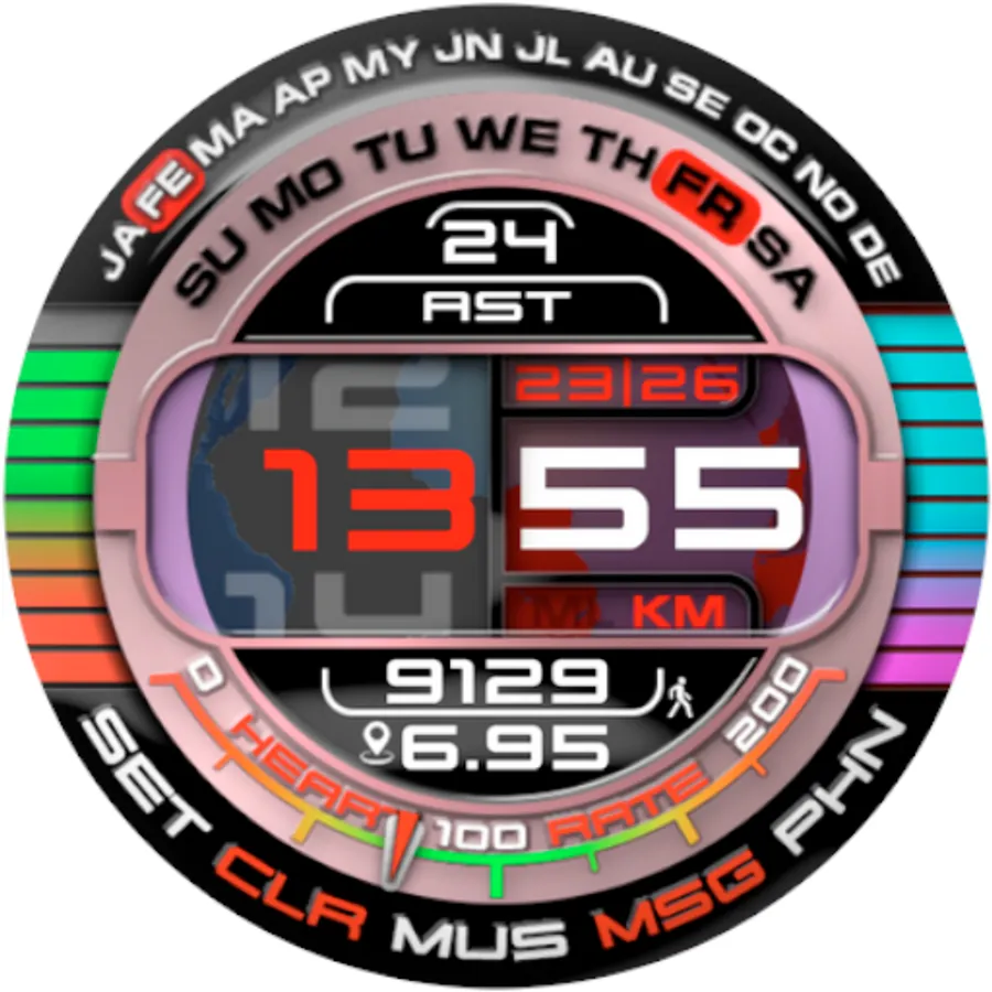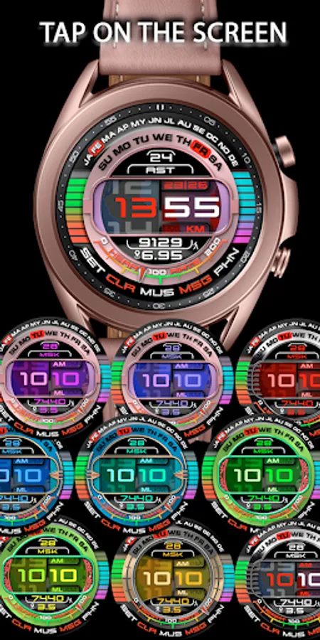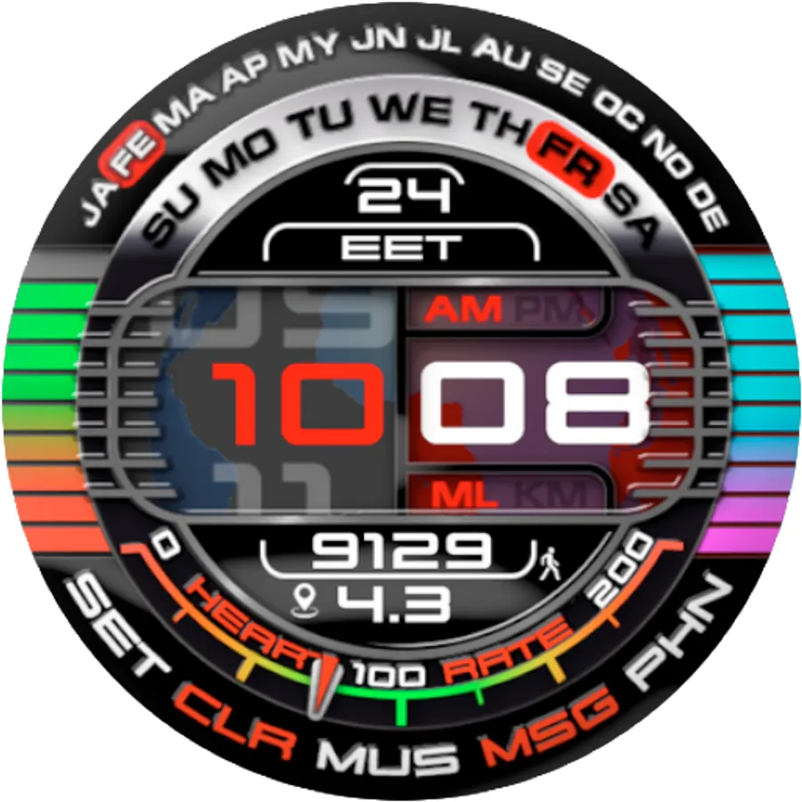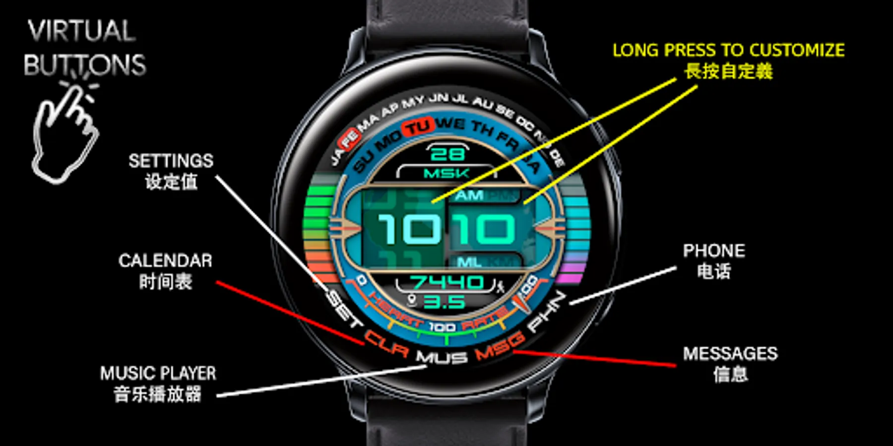 Watch face with a sporty striking design. Suitable for all ages and unisex. Easily customizable through the built-in menu, which is called by a long press on the watch face. There are 9 color schemes to choose from in the menu, which change the color of the characters and the color of the back screen. You can also choose from five watch designs.