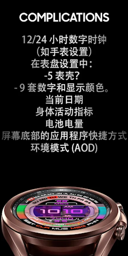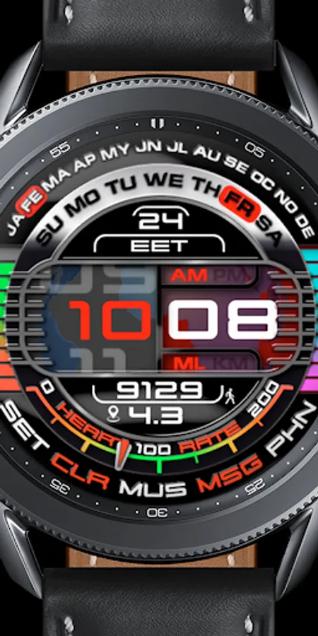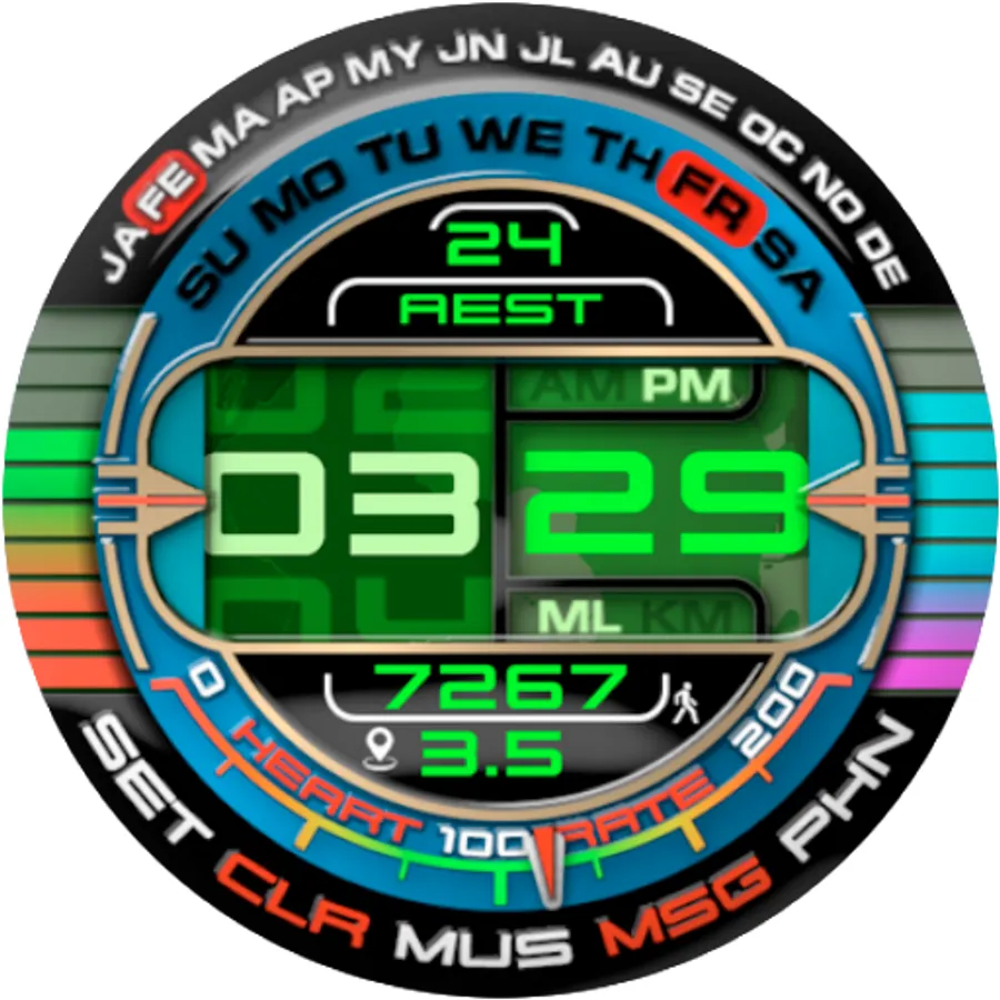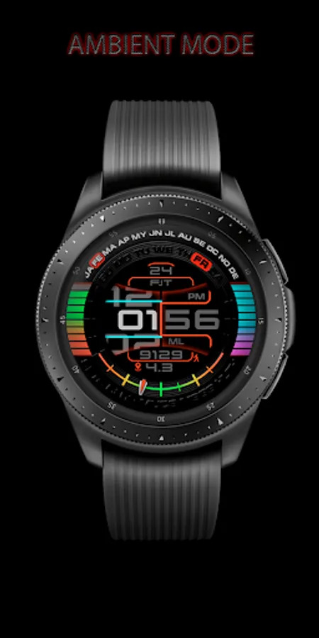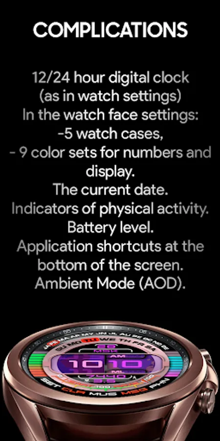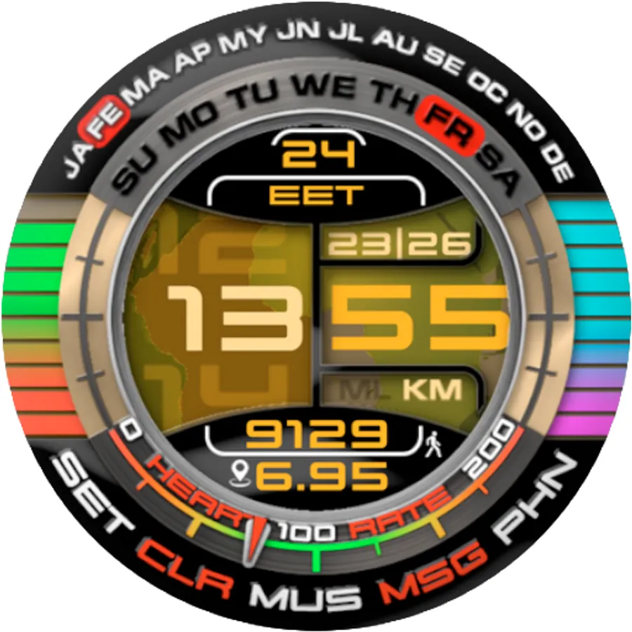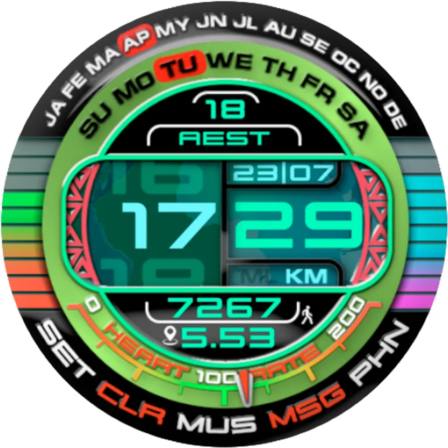 Watch face with a sporty striking design. Suitable for all ages and unisex. Easily customizable through the built-in menu, which is called by a long press on the watch face. There are 9 color schemes to choose from in the menu, which change the color of the characters and the color of the back screen. You can also choose from five watch designs.