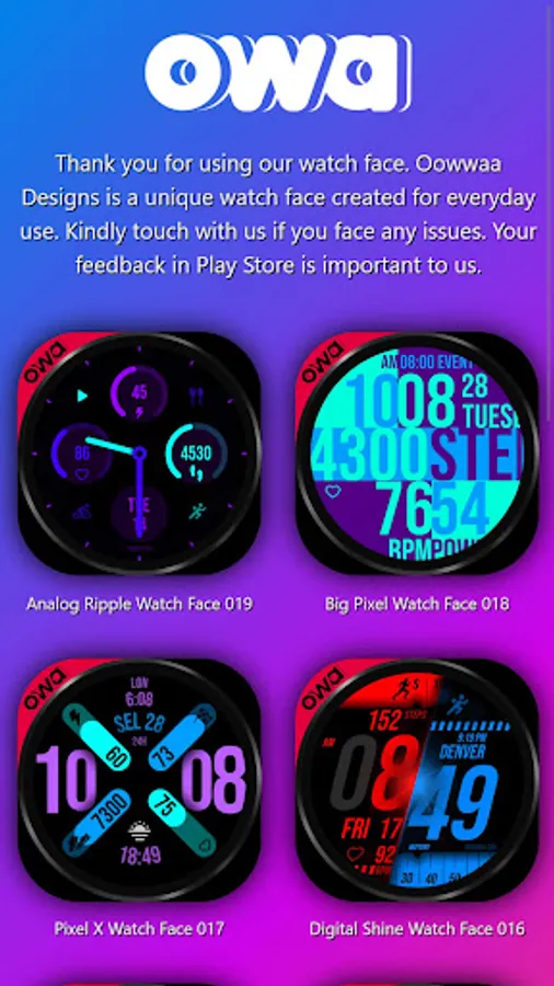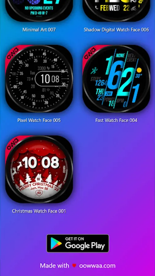 Access all the watch faces from Oowwaa in one place. Download the latest watch faces and free watch faces. Oowwaa Watchfaces is a unique watch face created for everyday use.