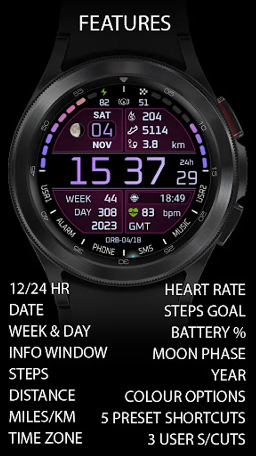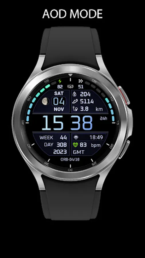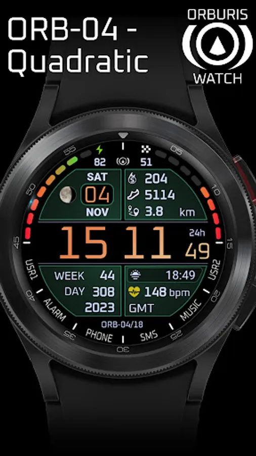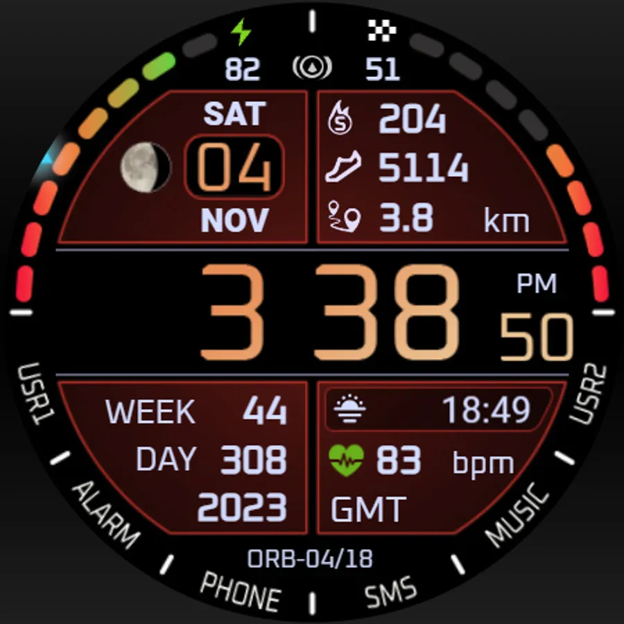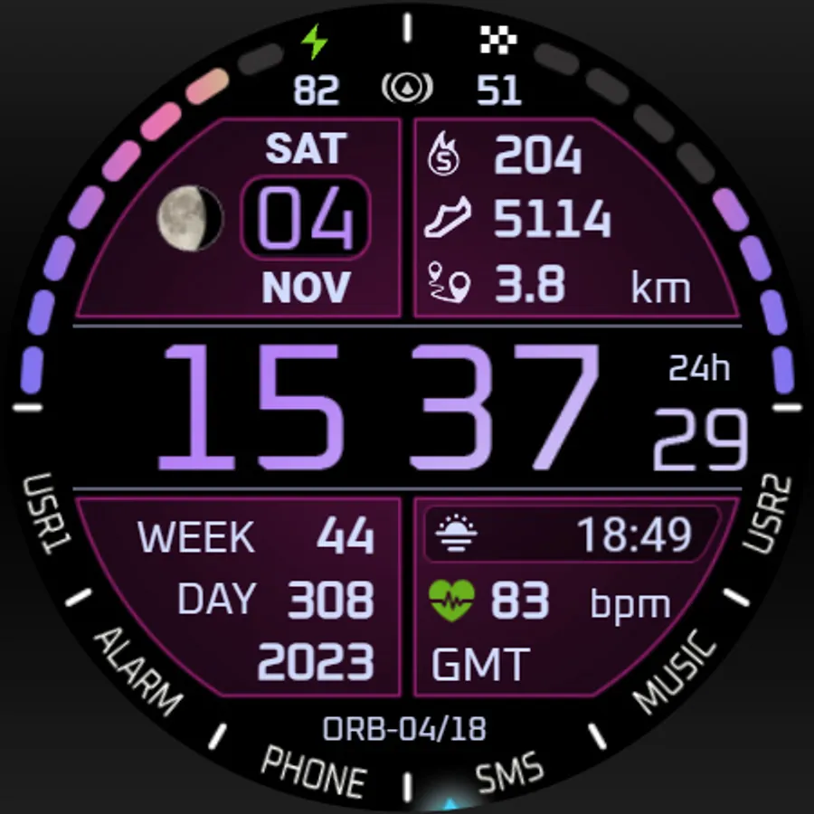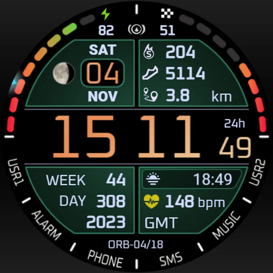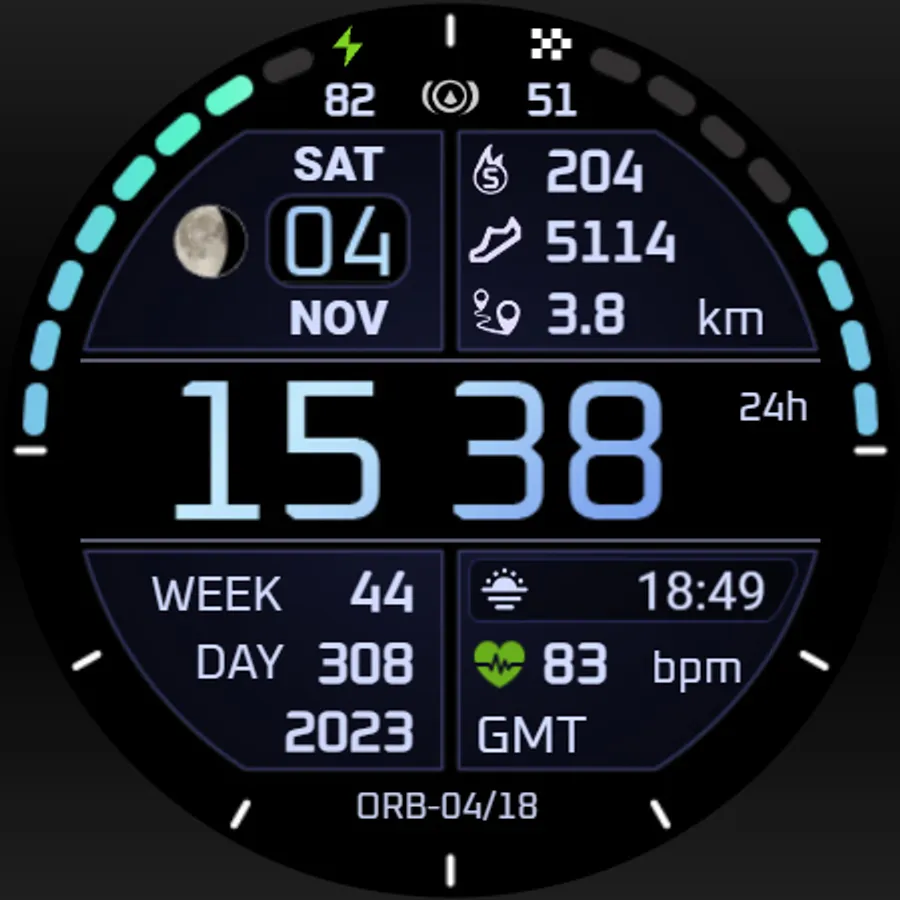 ORB-04 is a high-density information-rich watch face with a selection of complimentary and attractive colour options. The face is divided in to four information quadrants, making key data easy to assimilate at a glance. Suitable for those keeping an eye on fitness indicators and business functions.