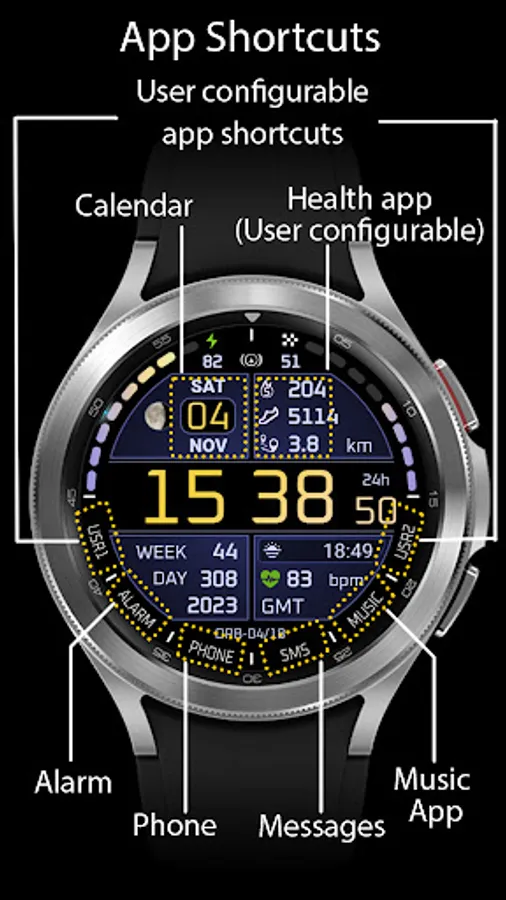 - User-definable shortcuts Health App, USR1 and USR2 can be initially set by tapping the field and choosing the application to be opened. To change, long press the watch face, select Customise, tap the relevant field and select the new app.