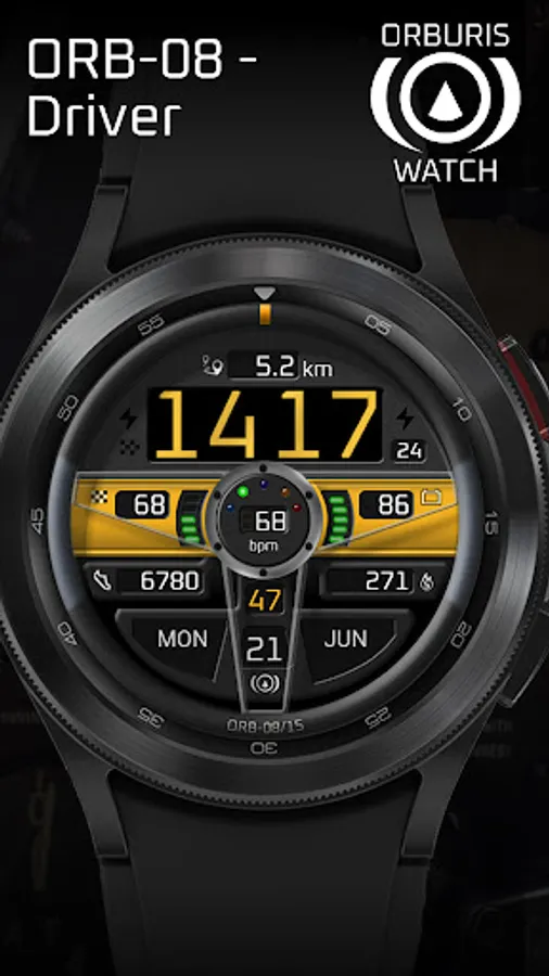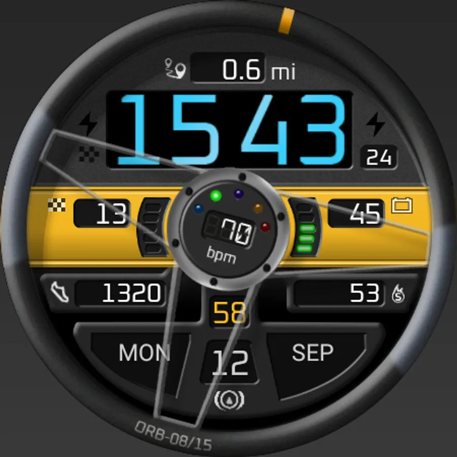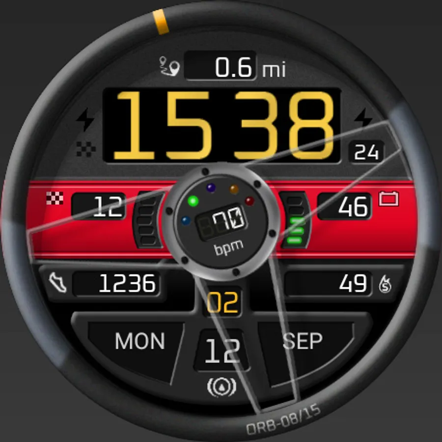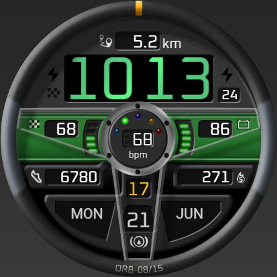 ORB-08 offers a view from the driver’s seat, with a steering wheel which rotates as the wearer moves their arm. The main dashboard display visible through the top half of the wheel shows the time, distance and several warning lamps. A central horizontal dash strip houses the steps goal and battery displays while various pods in the lower half of the wheel show a wealth of supplementary information.