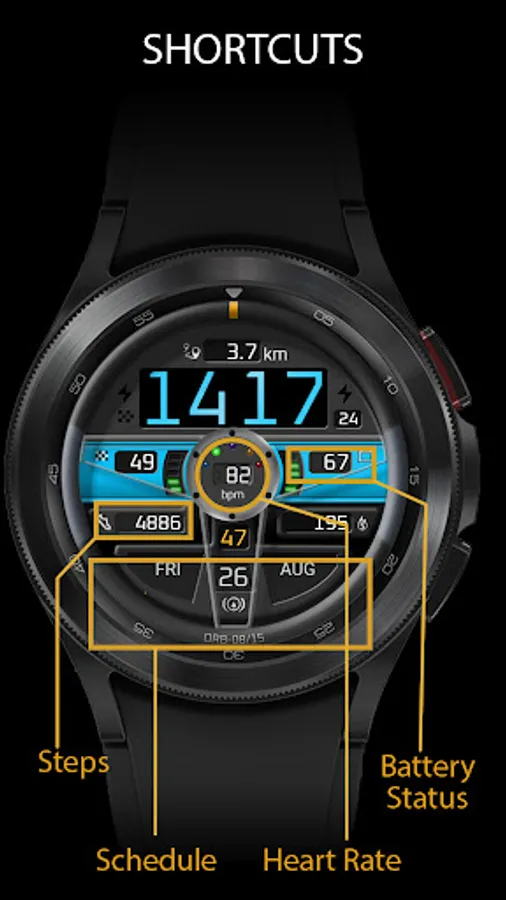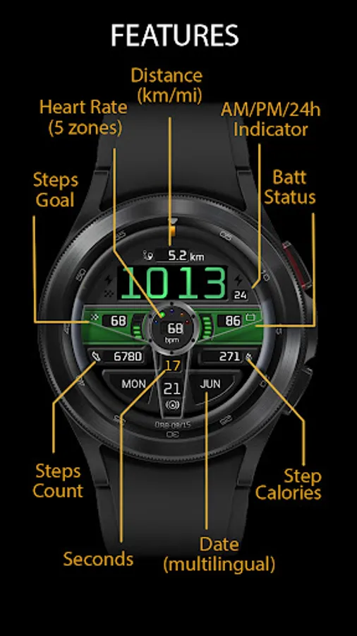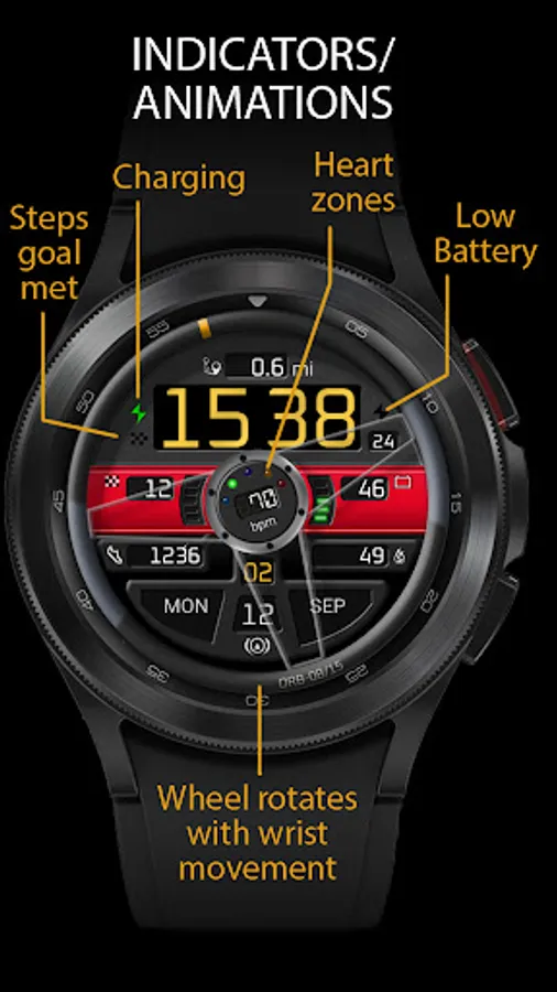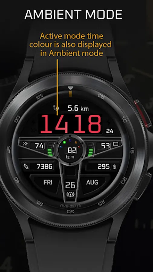 This watchface is based upon a version originally developed for Samsung’s Tizen-powered watches and uses the Watch Face Studio development platform. As this development platform is relatively new there are some small functionality differences and/or limitations.