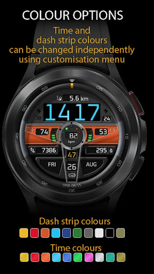 - Each has 10 options, selectable by long-pressing the watch face and tapping on “Customise”, and swiping to “Centre Dash Strip” and “Clock Colour” adjustment screens.