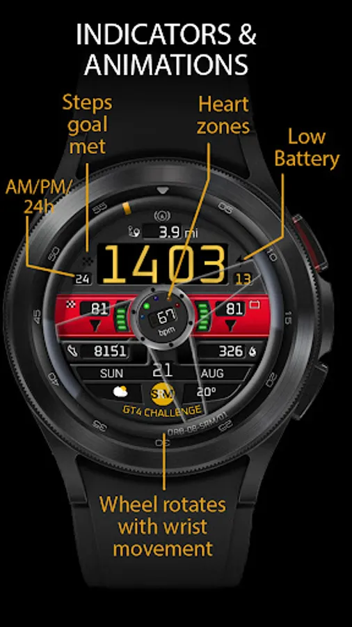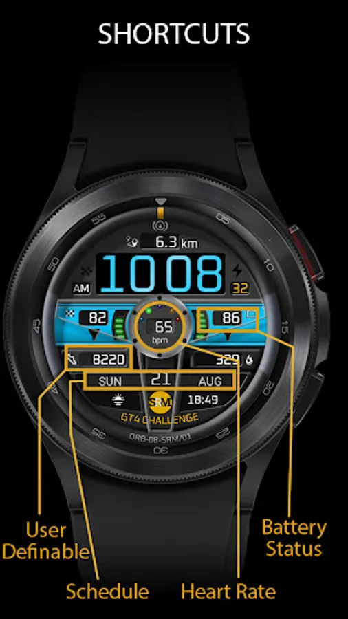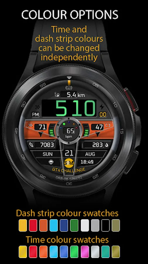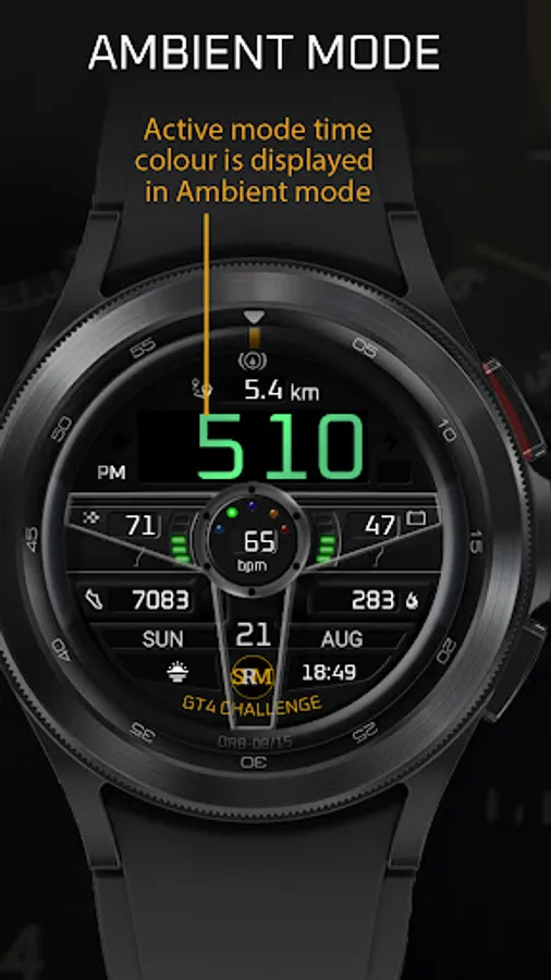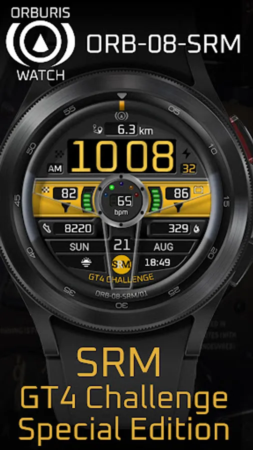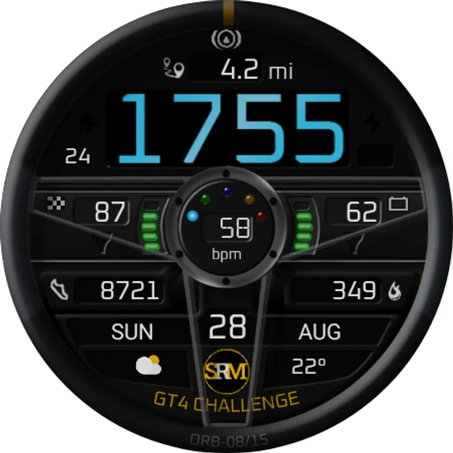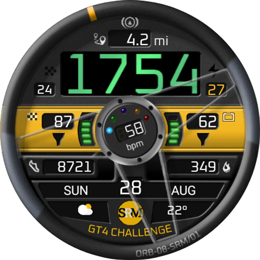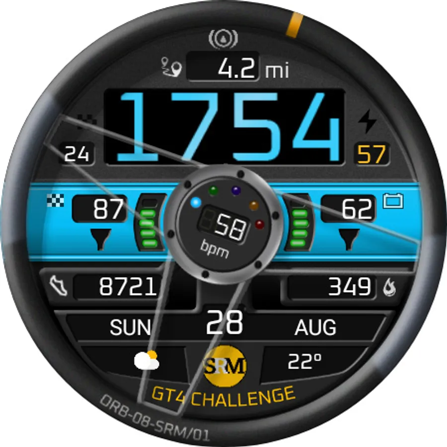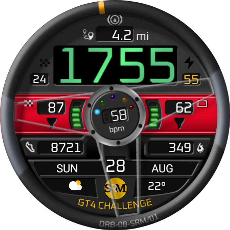 This version of the ORB-08 watch face is a celebration of that result featuring enhanced information content, the SRM logo and “GT4 Challenge” script.