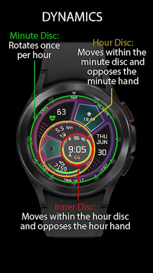 Features an hour hand and two crescent shaped display areas. This disc rotates every 12 hours whilst moving around the perimeter of the outer disc every hour.