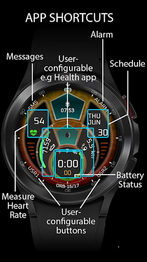 - A button overlaying the hour disc (excepting the inner disc) can be configured to be an app shortcut, e.g. a health application.