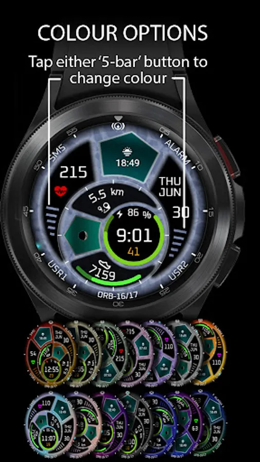 - 5-bar buttons: As almost all elements of the watch face are in constant motion, at times one of the 5-bar buttons may be partially overlapped by one of the action buttons located on the perimeter of the watch face. At such times use the alternative 5-bar button to change colours.