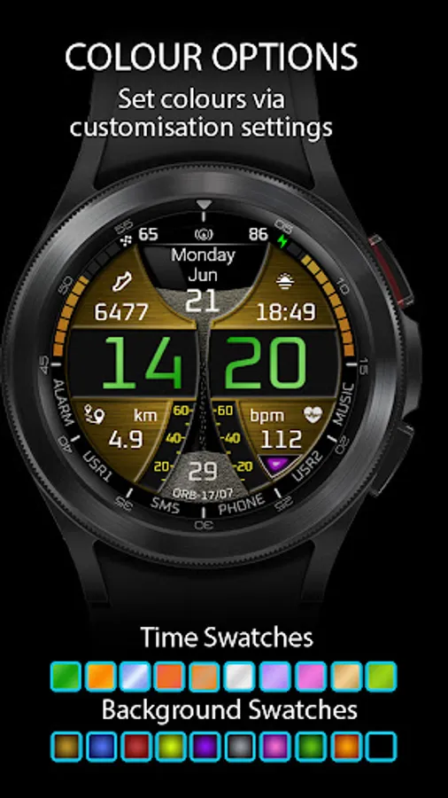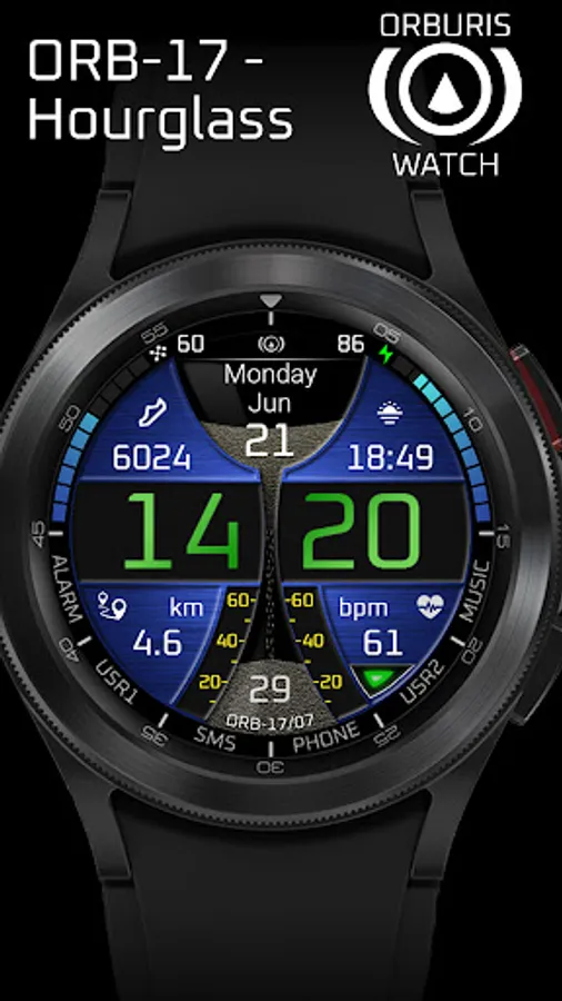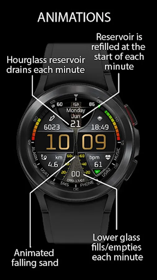 ORB-17 is a dynamic and colourful watch face based around a central animated hourglass.