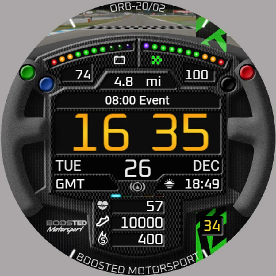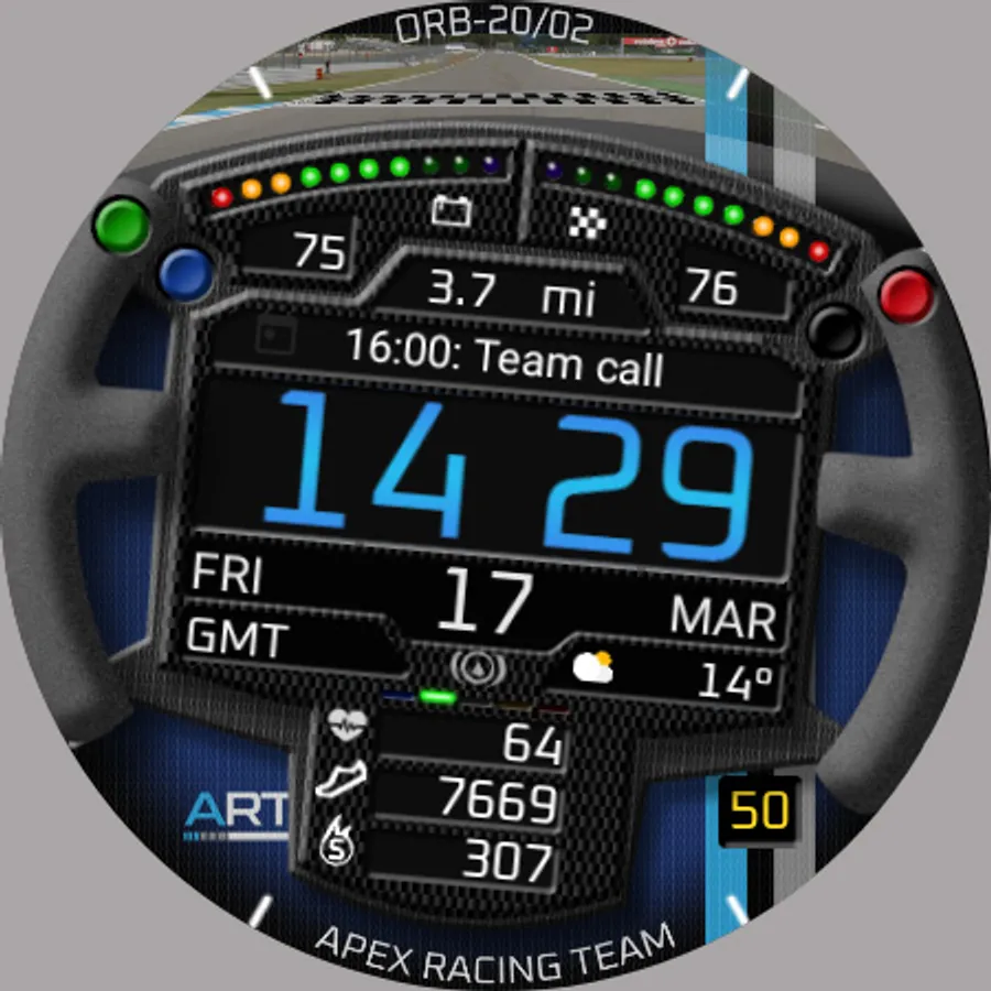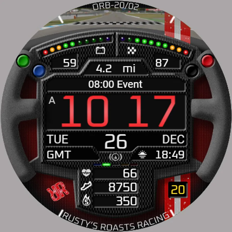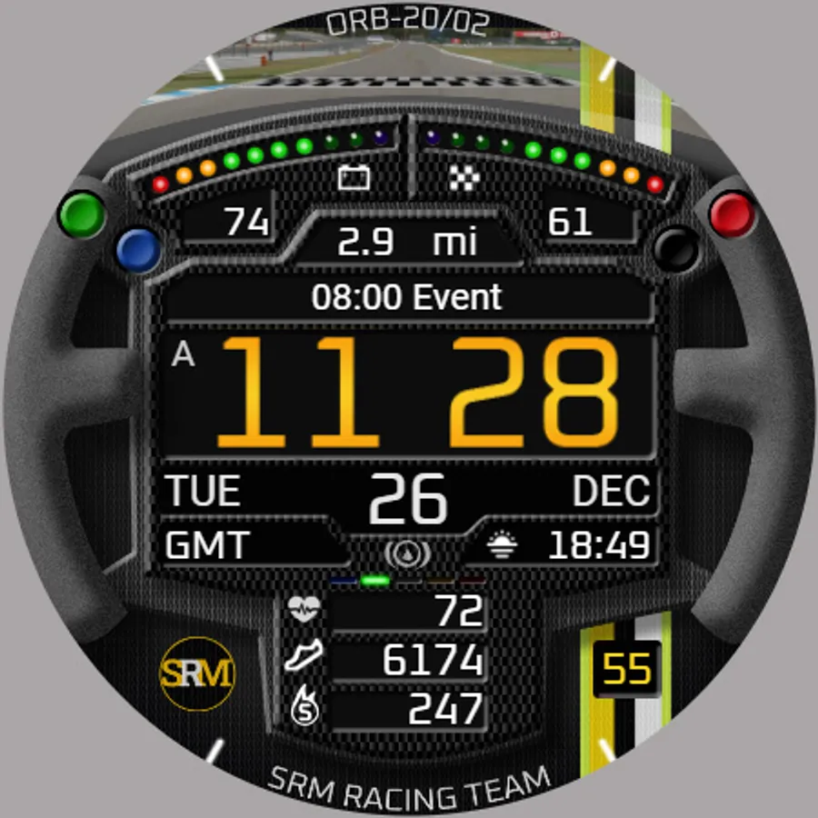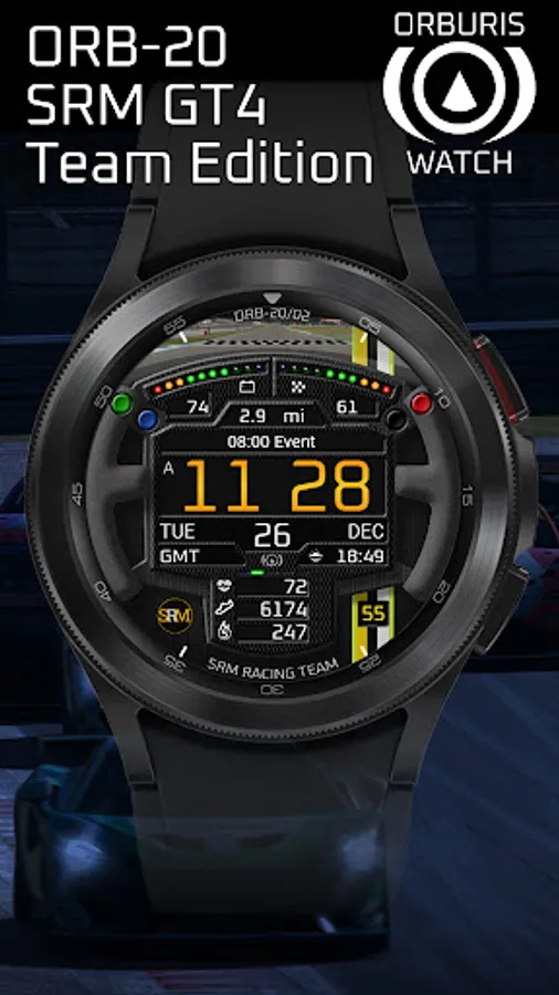 ORB-20 is a sim-racing-themed watchface celebrating the SRM GT4 Challenge sim-racing series. Based on a GT-style racing steering wheel which rotates with the wearer’s wrist, this watchface can display the colours of 10 sim-racing teams.