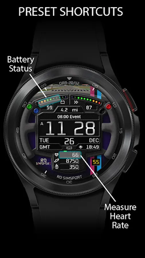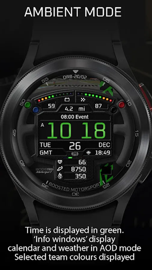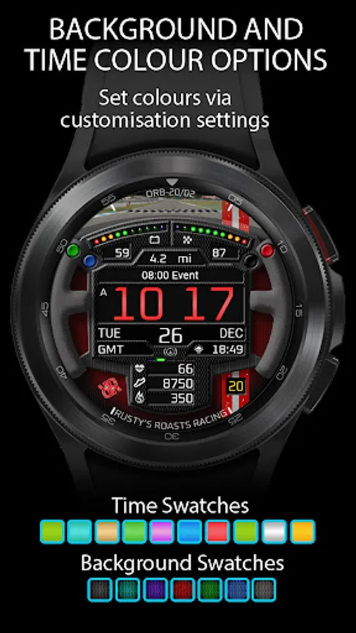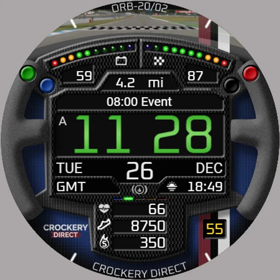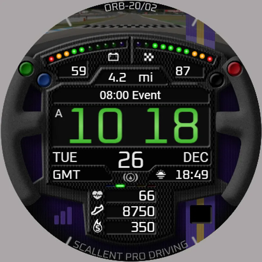 ORB-20 is a sim-racing-themed watchface celebrating the SRM GT4 Challenge sim-racing series. Based on a GT-style racing steering wheel which rotates with the wearer’s wrist, this watchface can display the colours of 10 sim-racing teams.