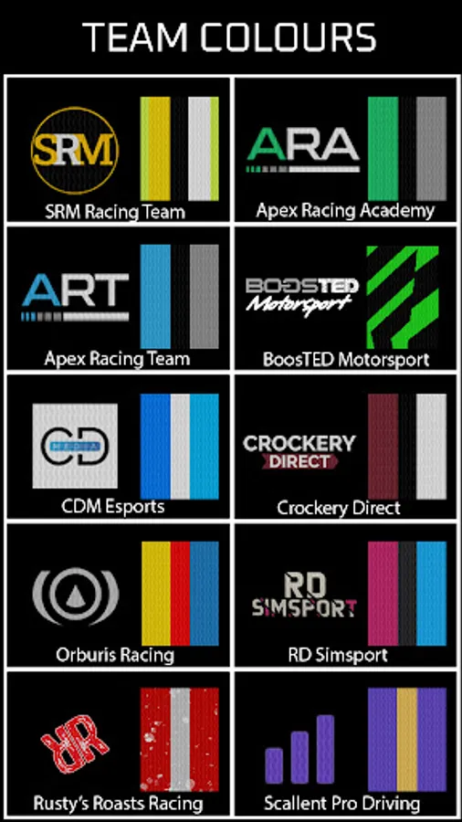 There are 10 sim-racing team names/logo/colours that can be selected:
