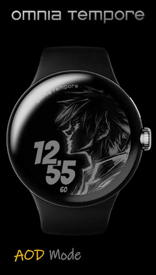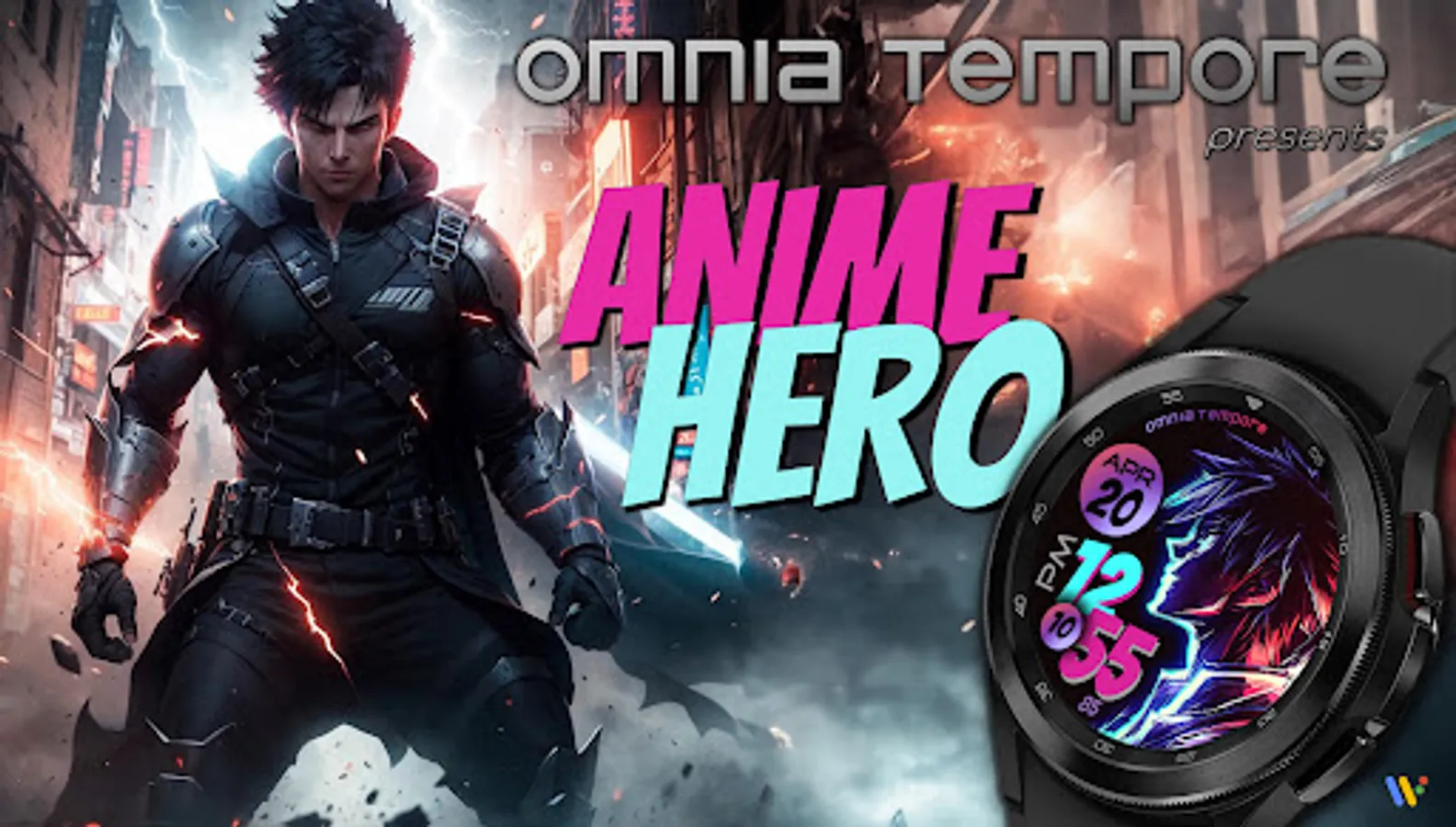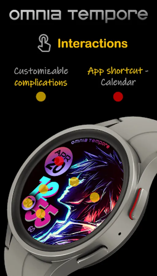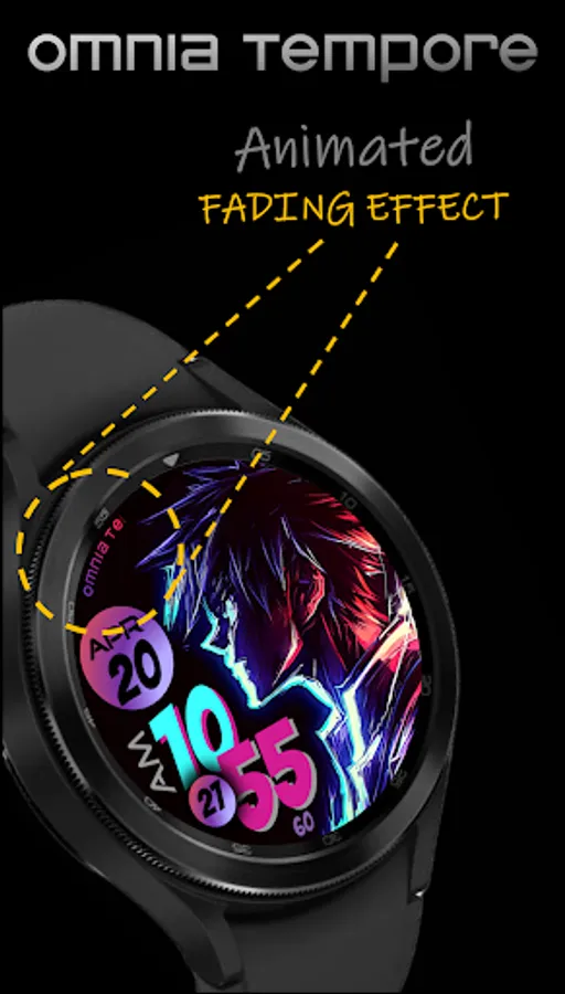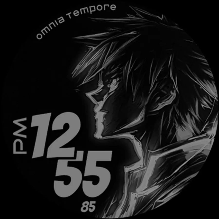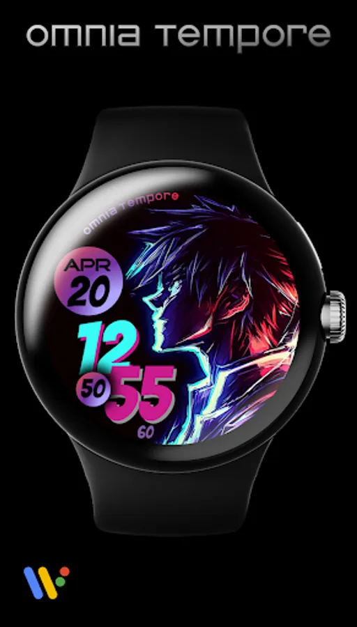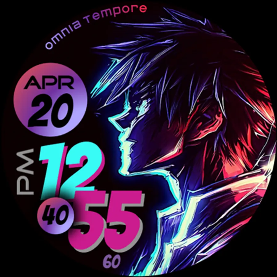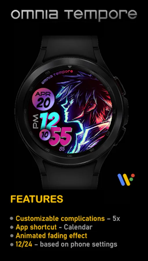 A modern-looking digital watch face in anime style from Omnia Tempore with customizable complications (5x), app shortcut (Calendar) and animated fading effect.
