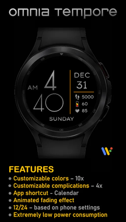 Simple but handy digital watch face for Wear OS devices with customizable colors (10x) and complications (4x). Extremely low power consumption - perfect for daily use.