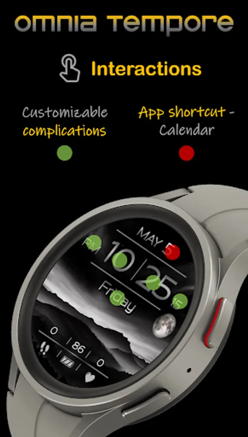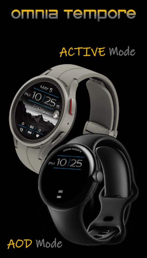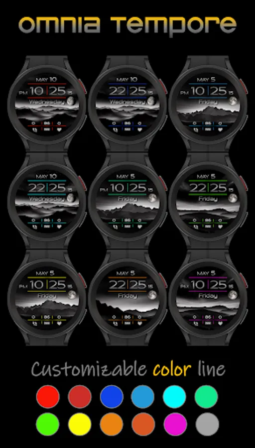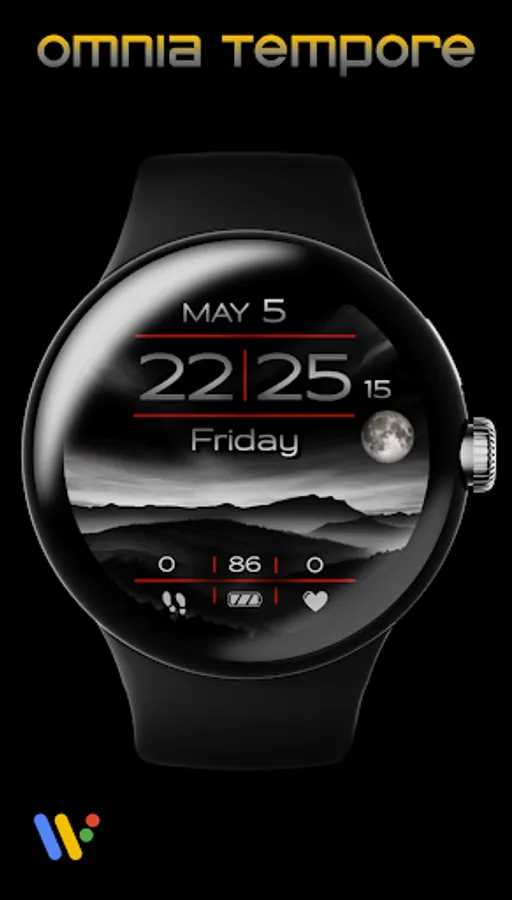 The first digital watch face model from the new "Landscape Scenery" series from Omnia Tempore for Wear OS devices. Includes 12 color variations, 10 customizable backgrounds, 5 customizable complications and one shortcut (Calendar). Moreover, the Moon phase visual display, measure heart rate and the step count features are added to the Omnia Tempore´s watch face for the first time. Ideal for the lovers of landscape scenery.