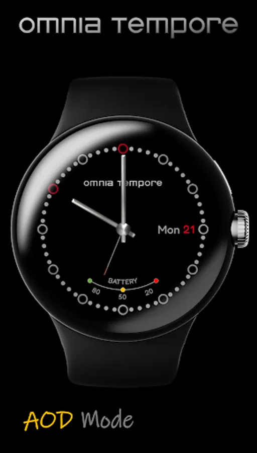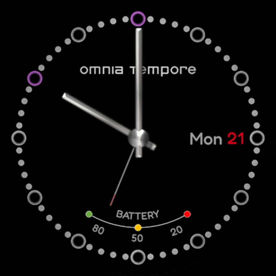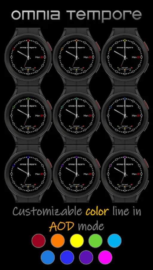 A classic, discreet and clear analog watch face from Omnia Tempore with 9 customizable color variations in AOD mode. Ideal for everyday use. Perfect for lovers of minimalism.
