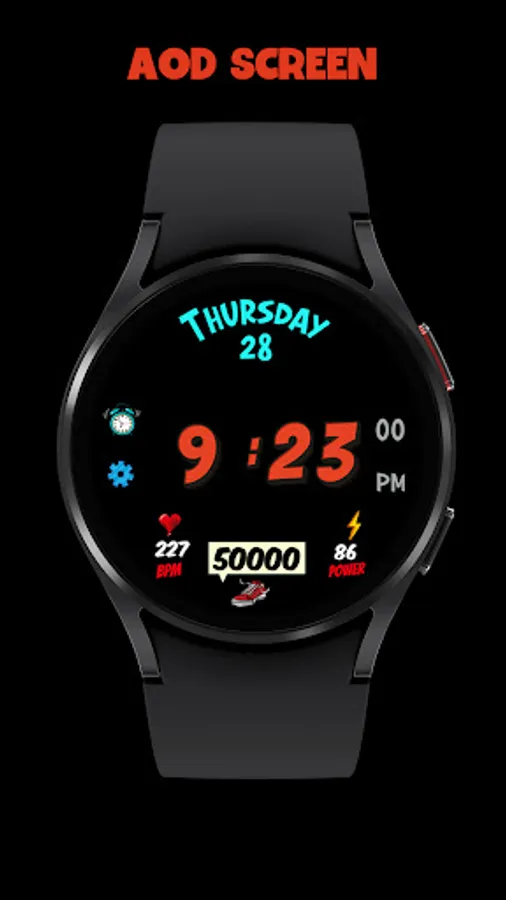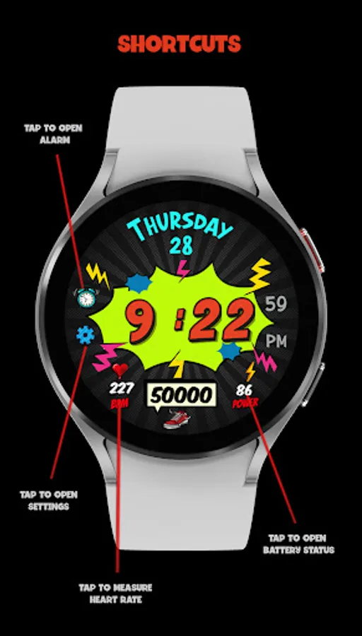 * Alarm, Settings, Battery Status and Heart Rate App shortcuts.