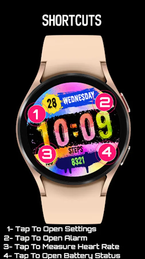* Alarm, Settings, Battery Status and Heart Rate App shortcuts.