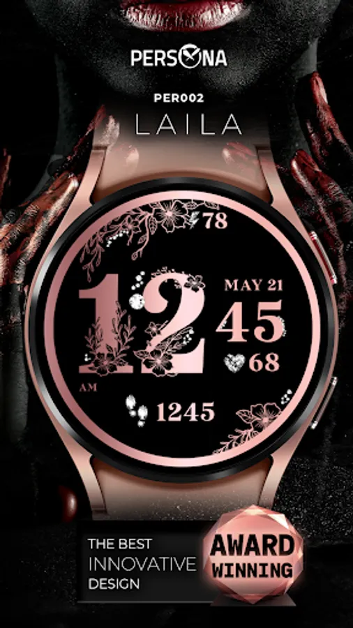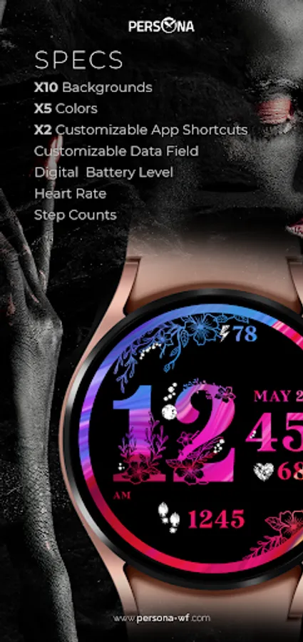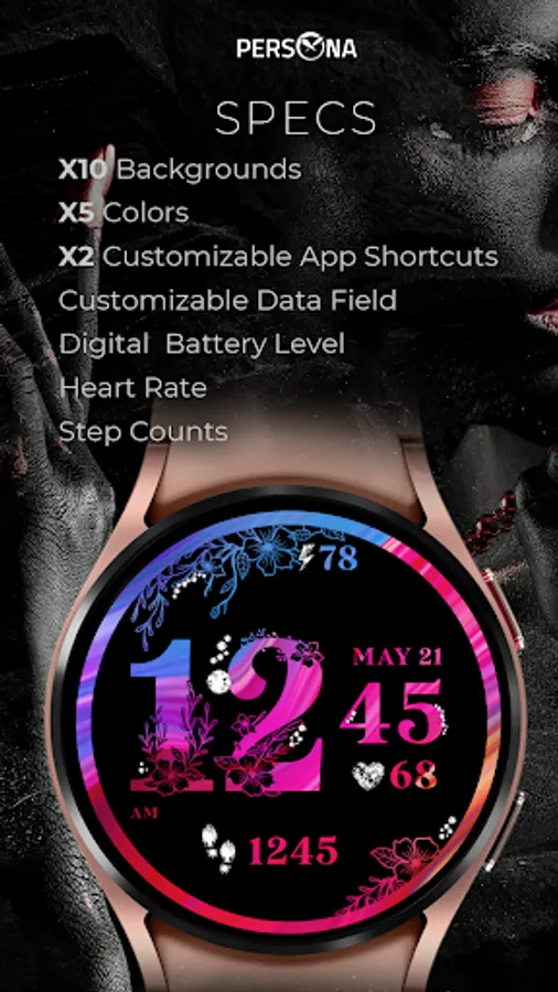 PER002 - Laila contains 2 preset shortcuts, 2 customizable shortcuts, 2 customizable fields/complications, steps, heart rate, changeable backgrounds, changeable colors, and more…