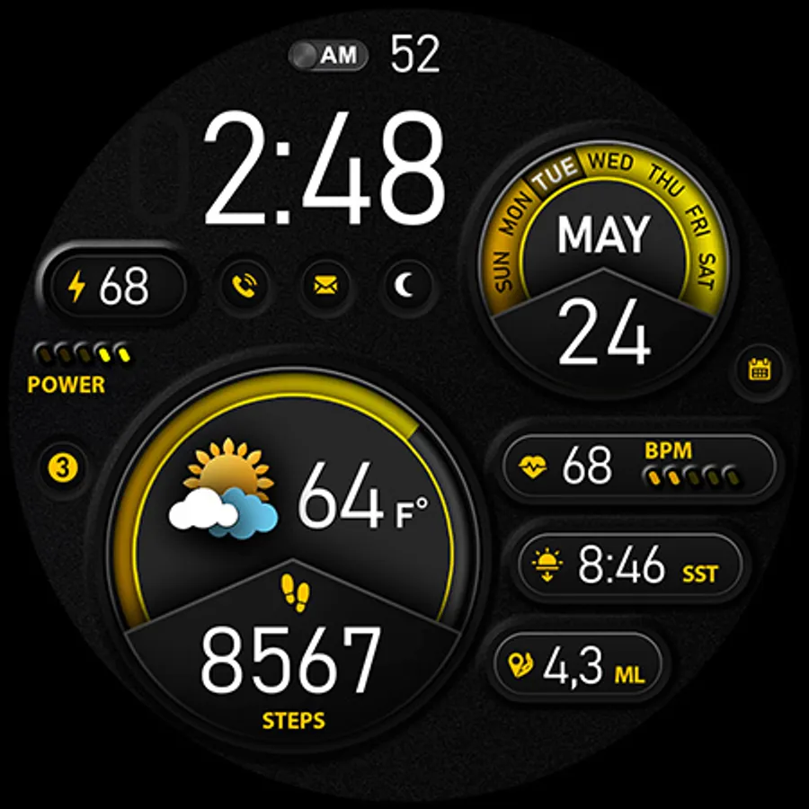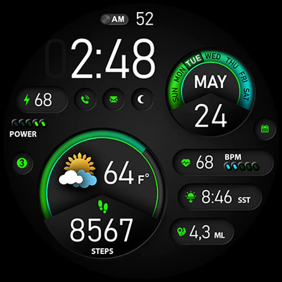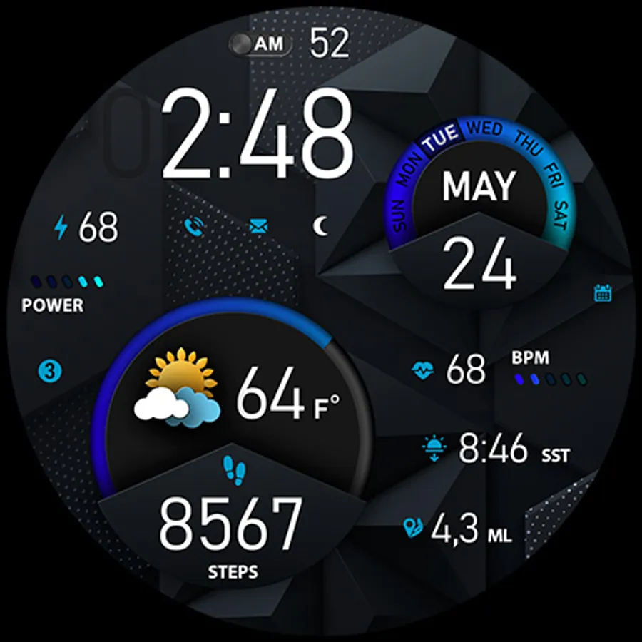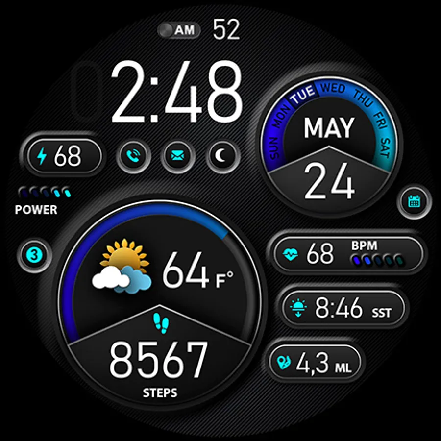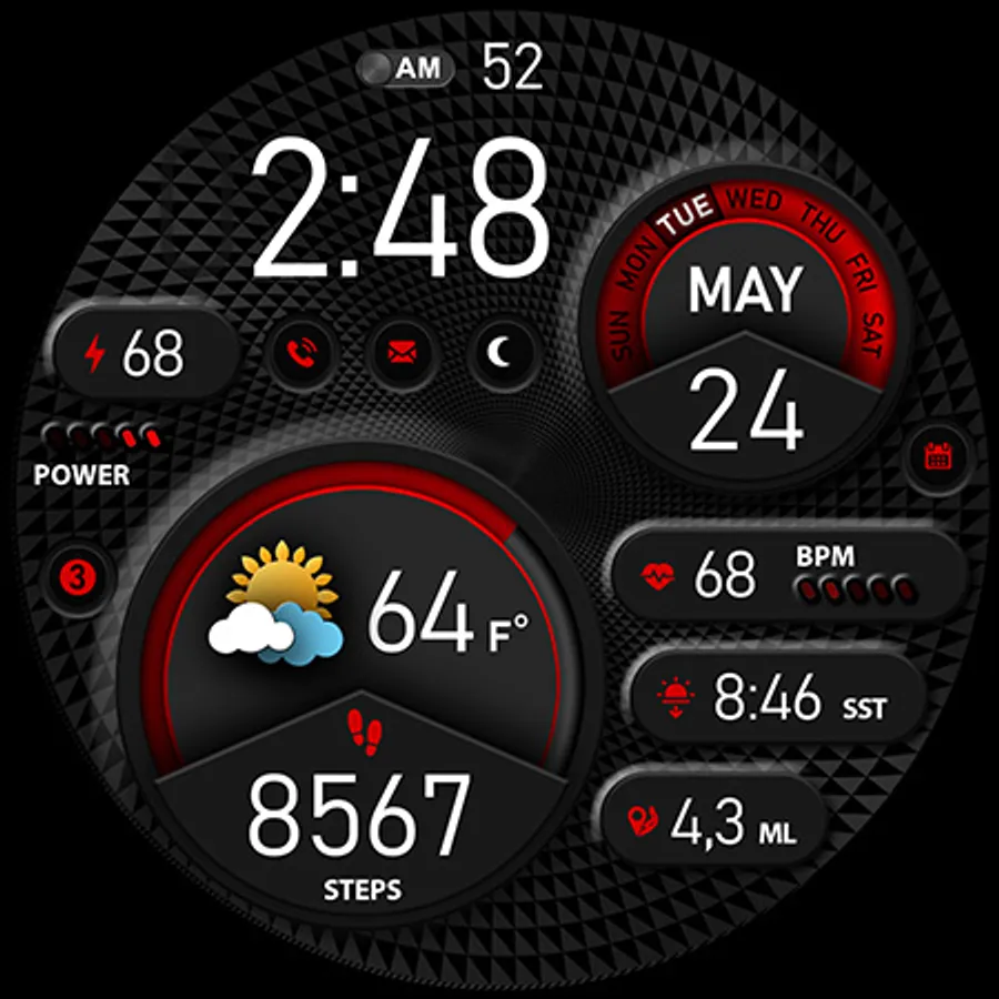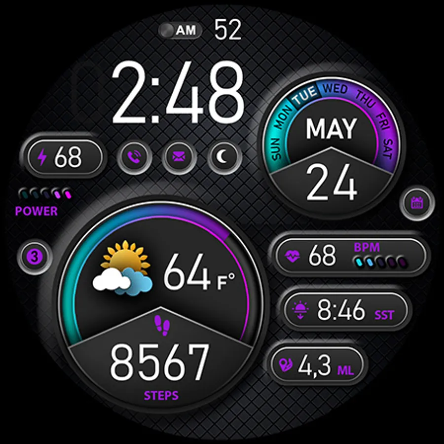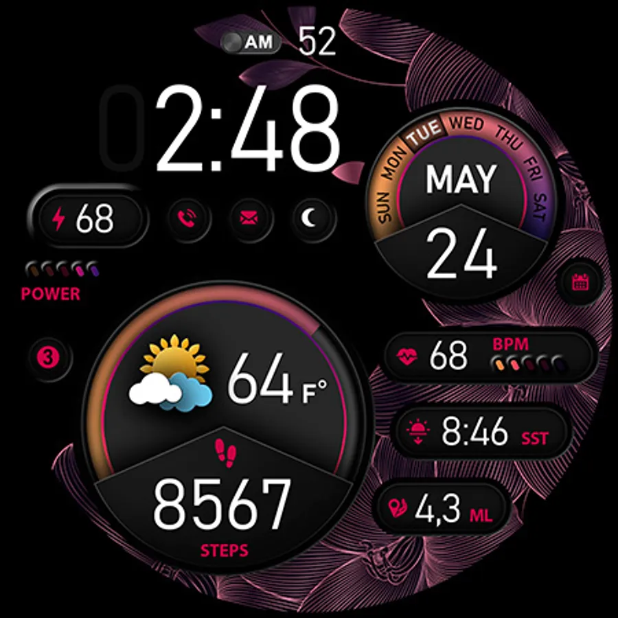 PER015 - Luna contains changeable backgrounds, colors,, 3 preset app shortcuts, 2 customizable shortcuts, steps, heart rate, distance, 2 customizable complications and more.