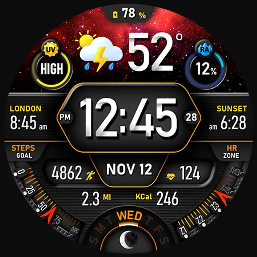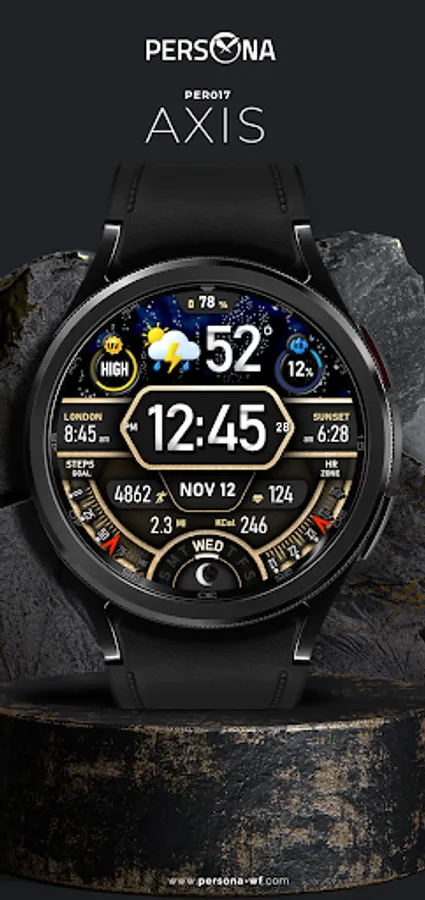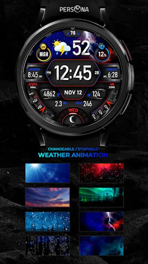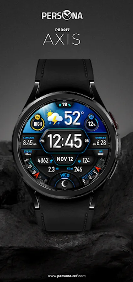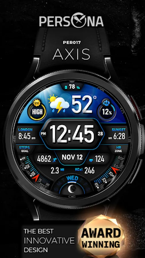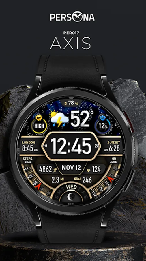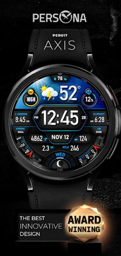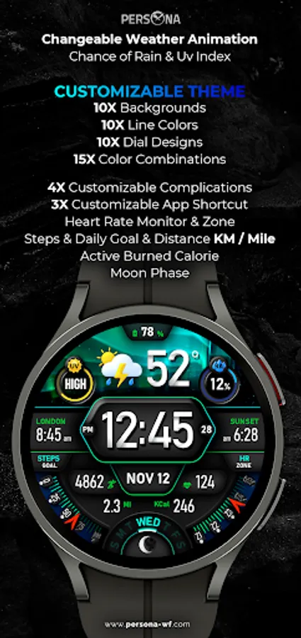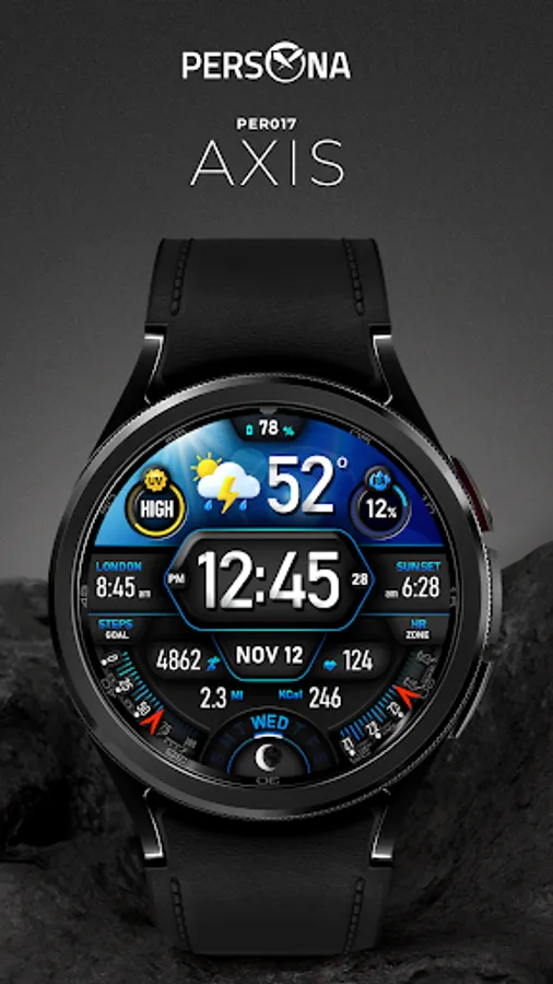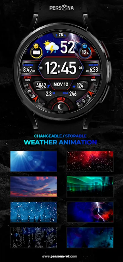 "PER017 Axis" contains changeable weather animation, UV Index, Chance of Rain, 10X backgrounds, 10X line colors, 10X dial designs, 15X colors, 4X customizable complications, 3X customizable app shortcut, heart rate monitor & zone, steps & daily goal & distance KM / Mile, and more.