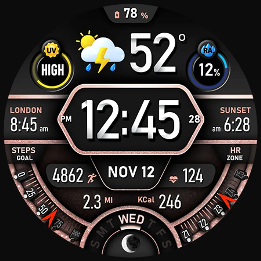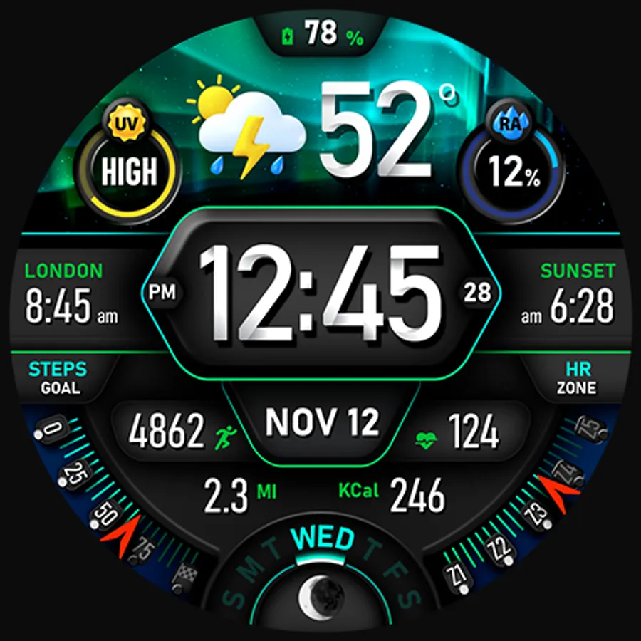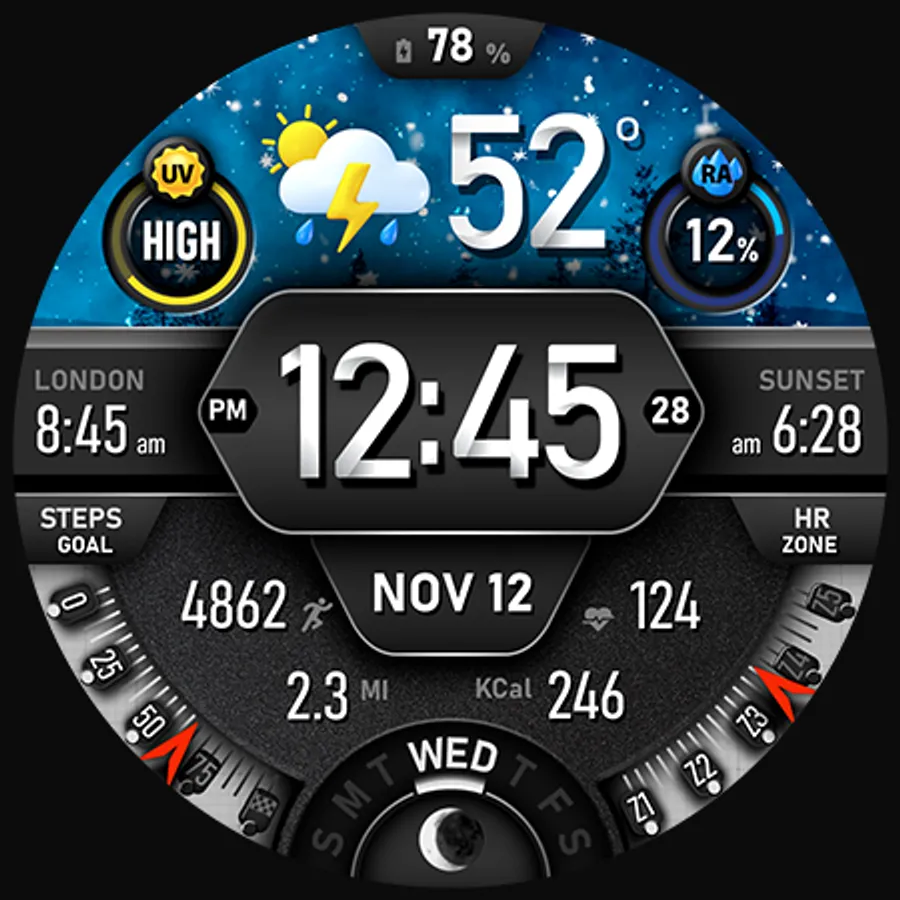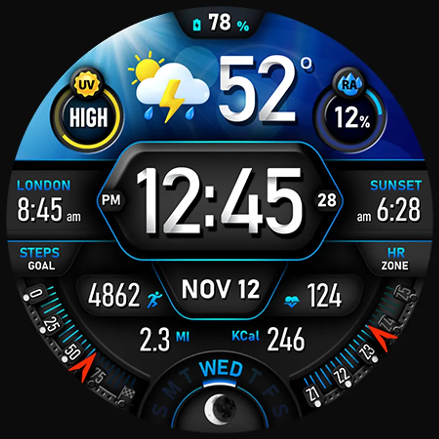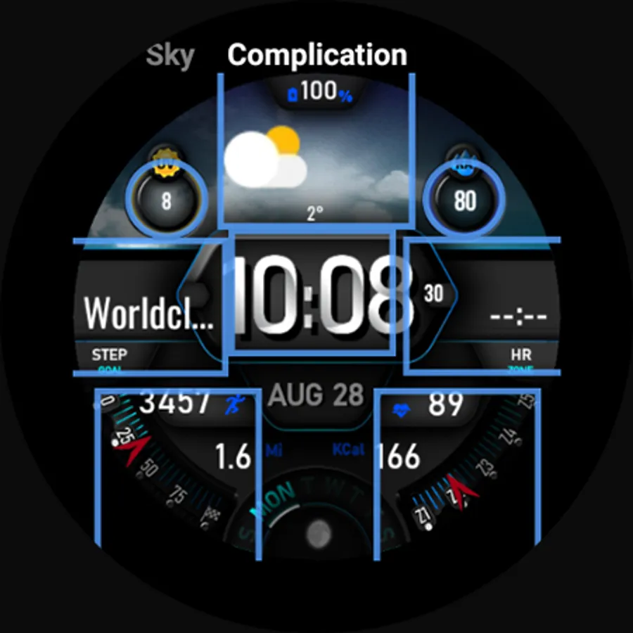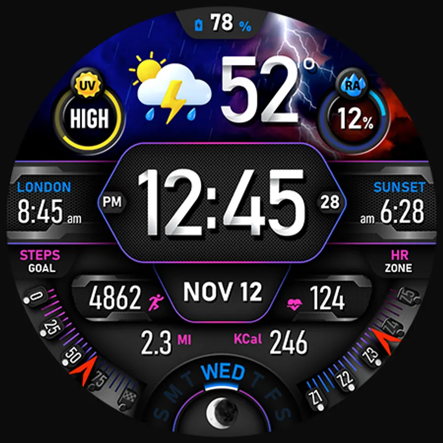 "PER017 Axis" contains changeable weather animation, UV Index, Chance of Rain, 10X backgrounds, 10X line colors, 10X dial designs, 15X colors, 4X customizable complications, 3X customizable app shortcut, heart rate monitor & zone, steps & daily goal & distance KM / Mile, and more.