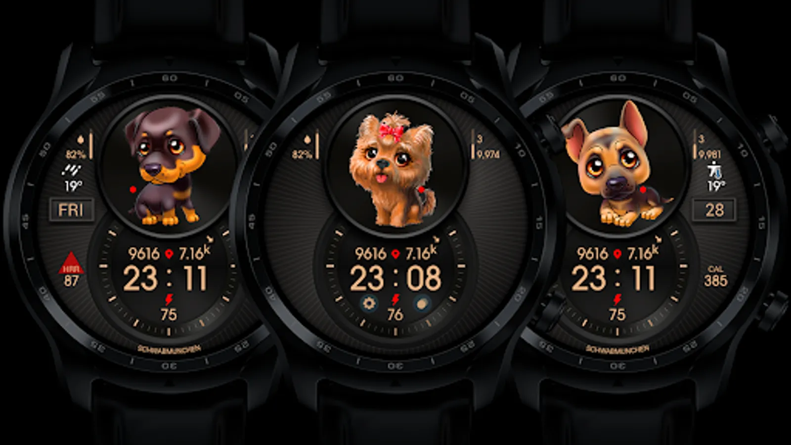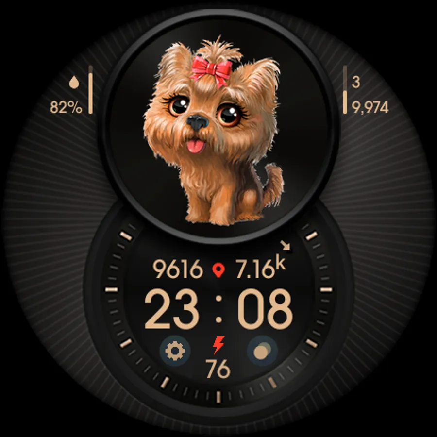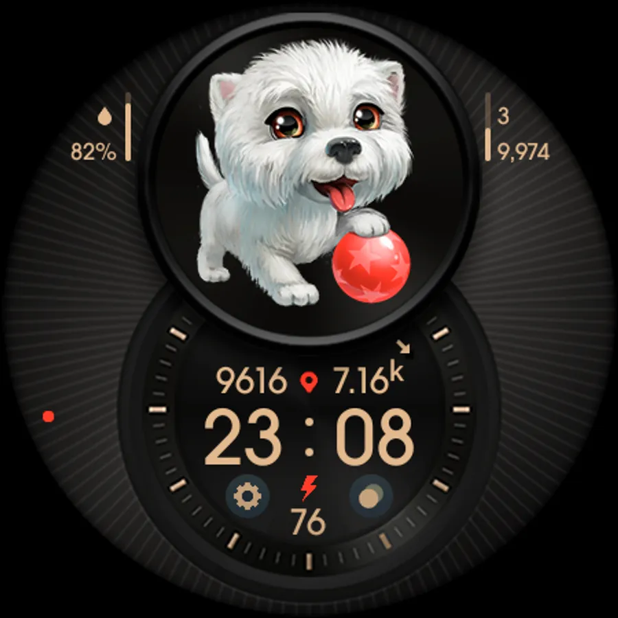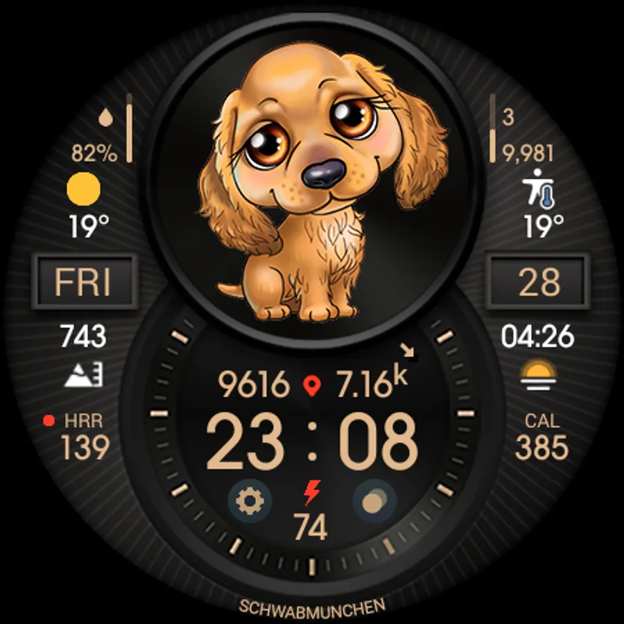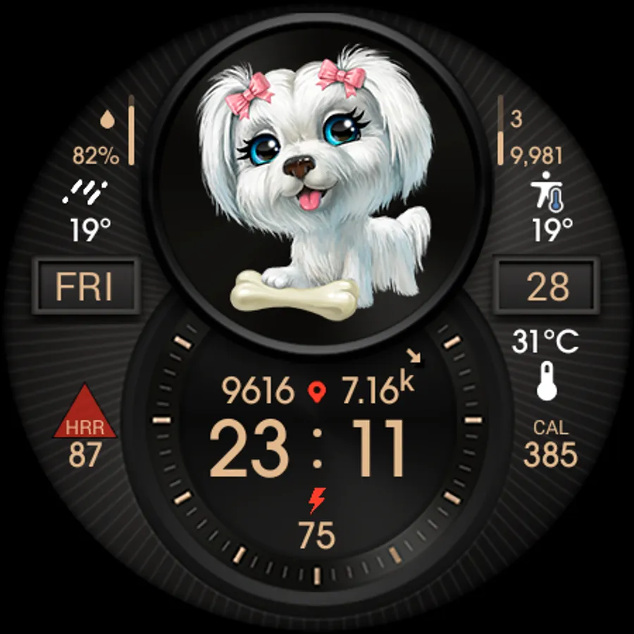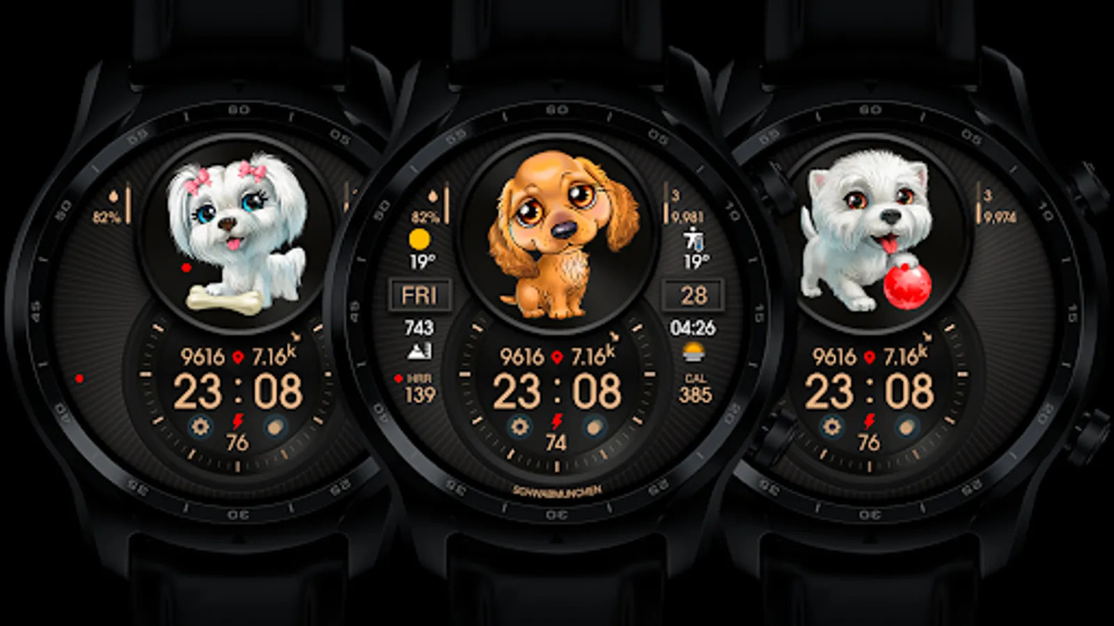 Digital informative watch face with cute puppies.