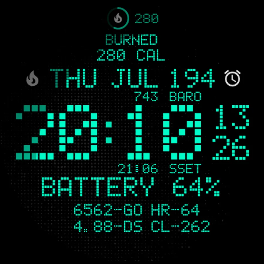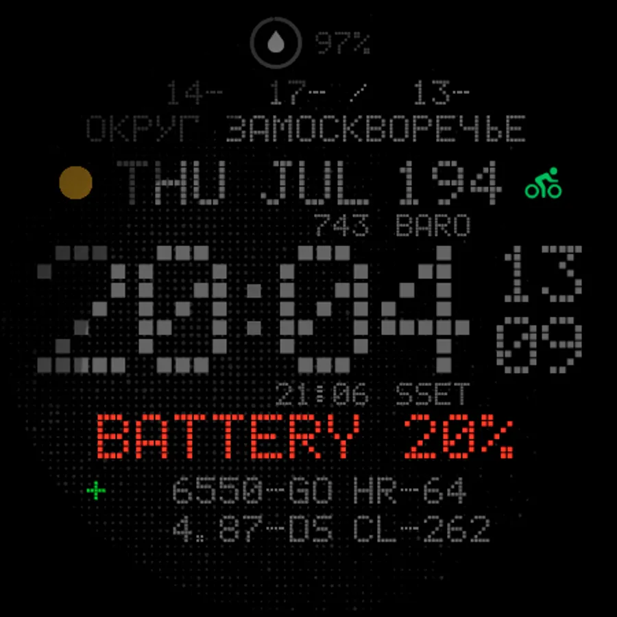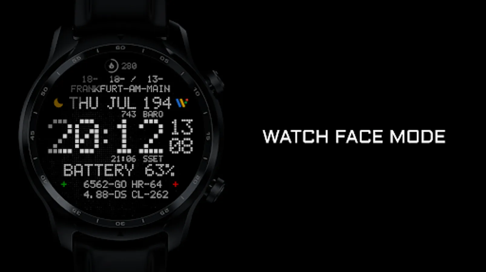 AOD mode support main mode watch face. In AOD mode digital seconds(replaced the week of the year) and active tap zones not active(software restriction). AOD mode data update once per minute.