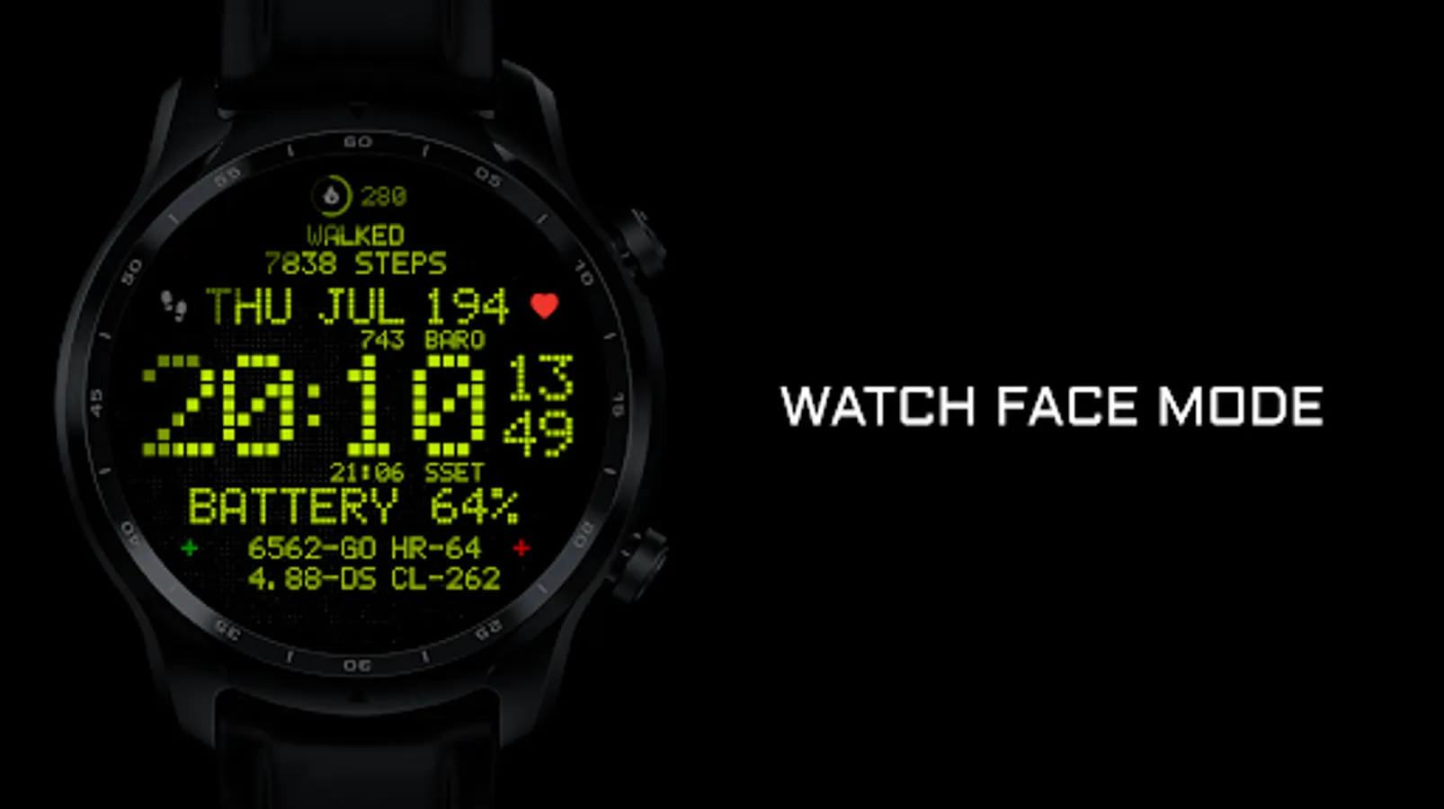 24H time mode format in phone - support distance in kilometers in watch face, 12H time mode format in phone - support distance in miles in watch face(watch face calculates distance based on steps taken, calculation of the burned calories is similar). 12H digital time mode format without leading zero.