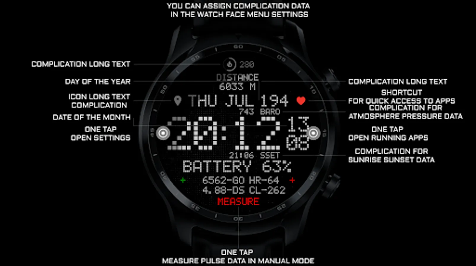 In the watch face available sports data, complications(data), visible & invisible shortcuts for quick access to apps.