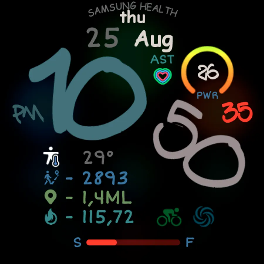 Bright sharp contrast digital informative watch face, support for all languages(depends on phone setting) - short name of the day of the week, complications (except Arabic, Portuguese language). Other inscriptions in English. "S"start - "F" finish - letters next too bottom progress bar(goal steps x10000 steps).