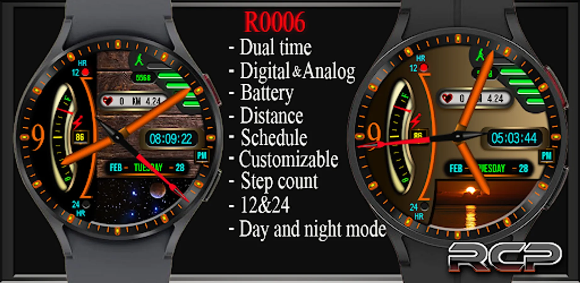 RCPR0006 is RCP Design's digital and analog watch Face for Wear operating system.