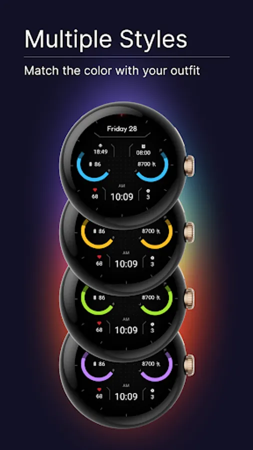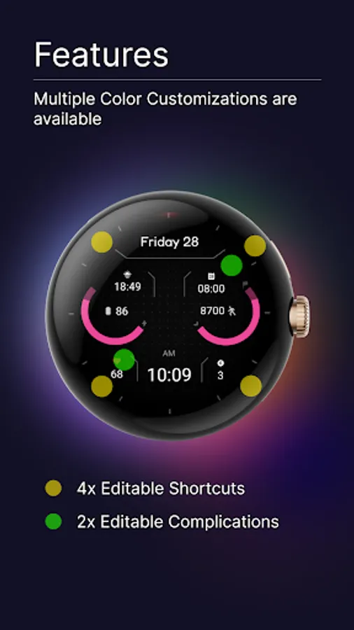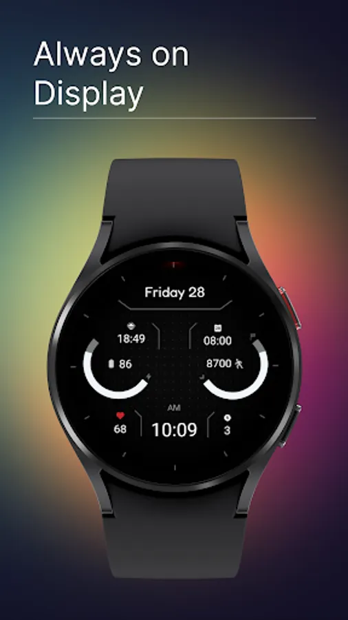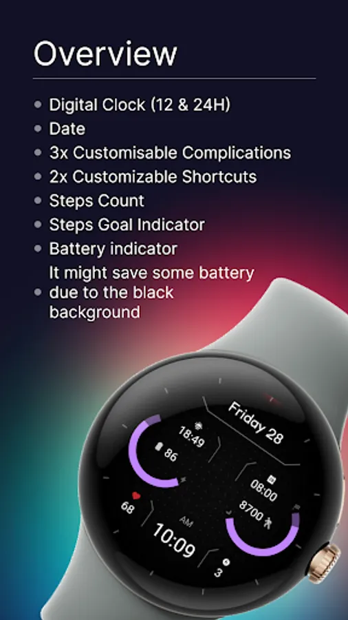 Minimalist watch face app for Wear OS devices. Clean design, customizable colors, and complications. Perfect for a sleek look.