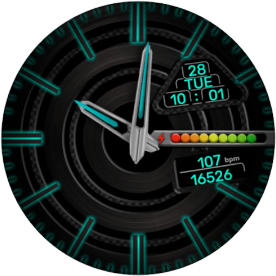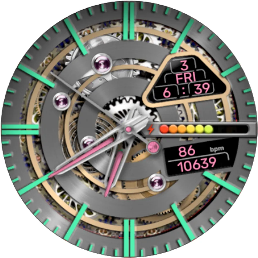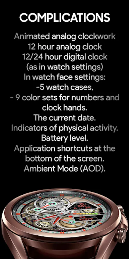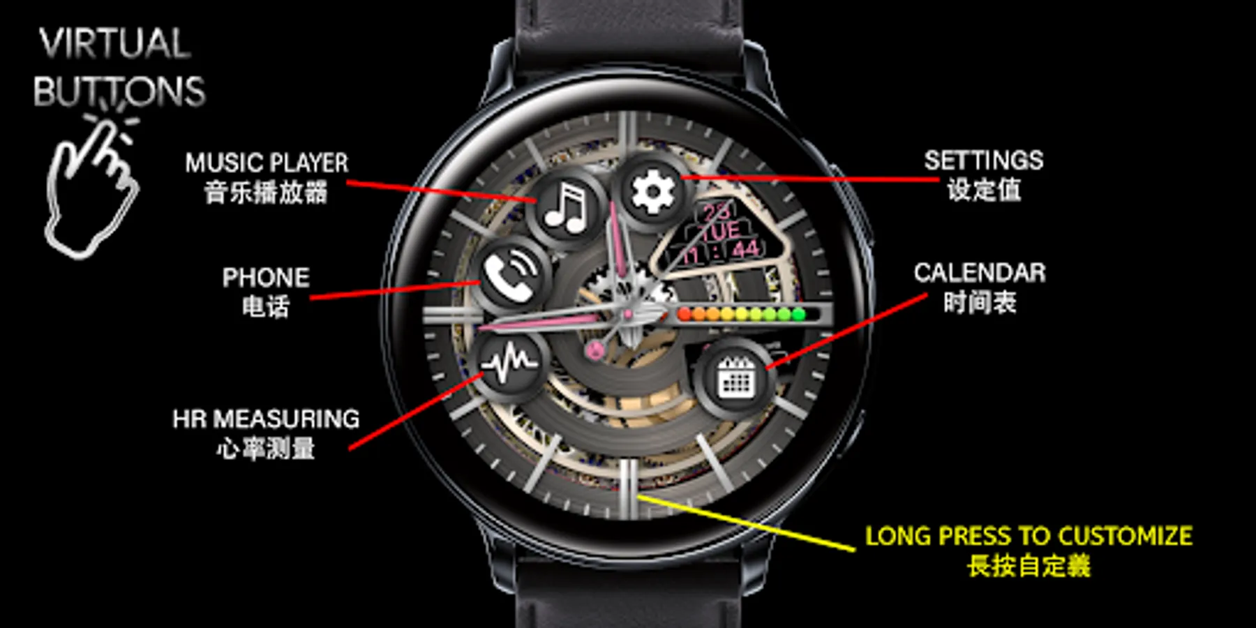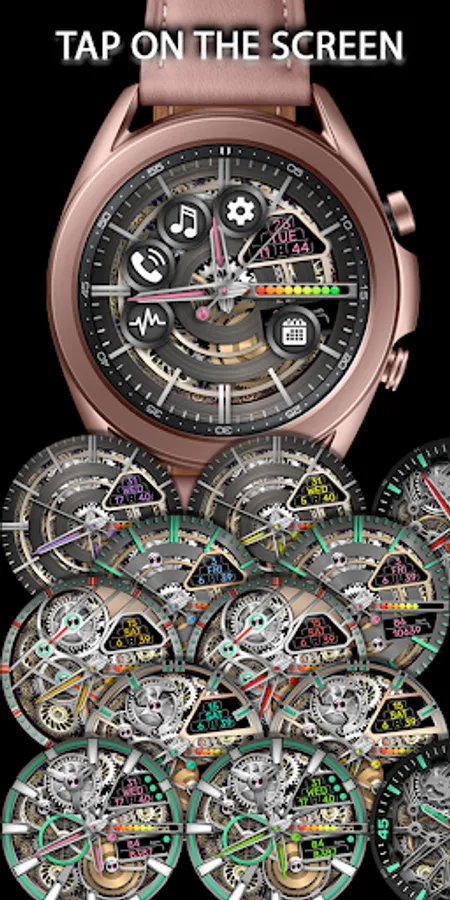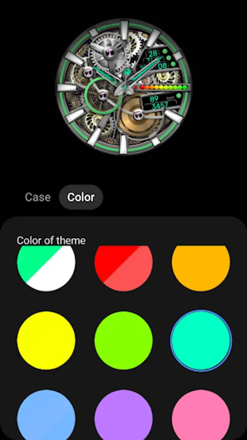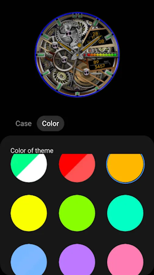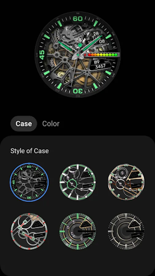 By holding your finger on the screen, you can open the customization menu. Customization allows you to select a different chronograph case and change the color of the hour hands and numerals.
