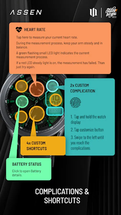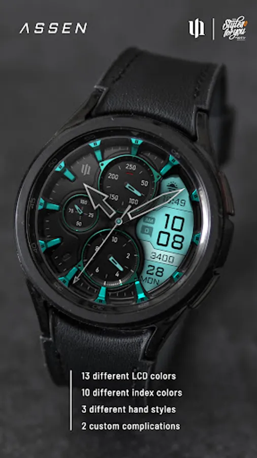 Enhance your Wear OS experience with the S4U Assen. A realistic analog watch face with an additional LCD screen to display some useful information. You can customize the colors, hands and have the option to set additional complications.