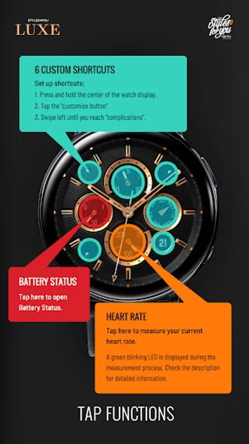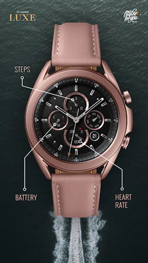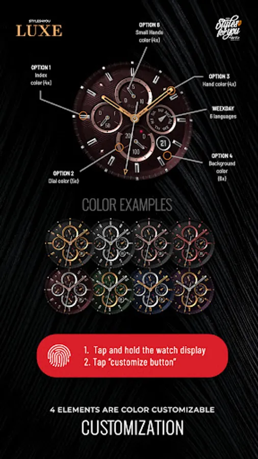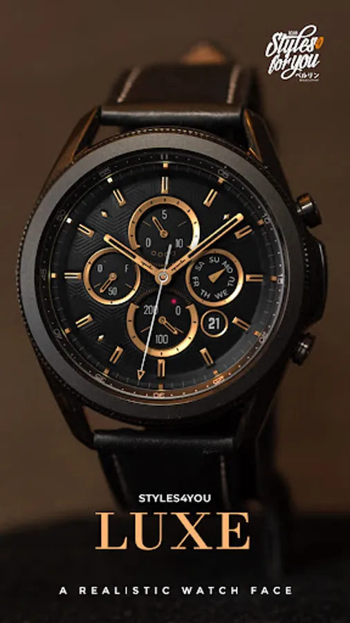 The S4U Luxe is another elegant ultra realistic analog watch face. The design is especially for people who prefer it luxurious. Main colors are: Gold, Silver, Bronze and Bloodmoon. The watchface comes with 6 individual shortcuts and multiple customization options. Check out the gallery for more information about the functionality and customizability.