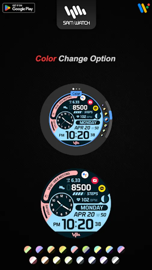 *The smartphone apps are additional apps that support downloading apps on Watchface devices. It may be different from the watchface screenshot of the smartphone app and the watchface screenshot that actually downloaded. Most of SamWatch’s Watchface app products include apps for smartphones.