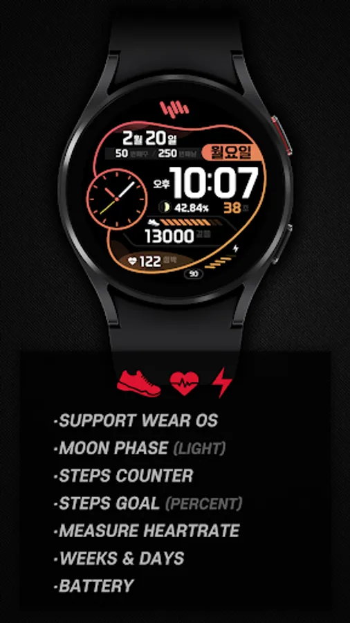 The WatchFace has a battery, a staps counter, and a heartrate measurement.