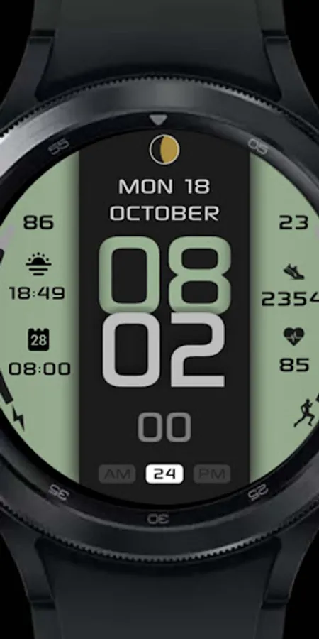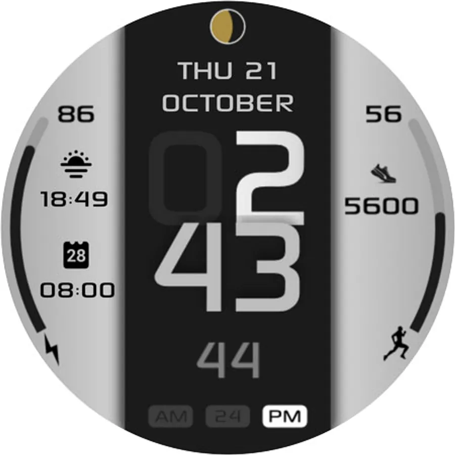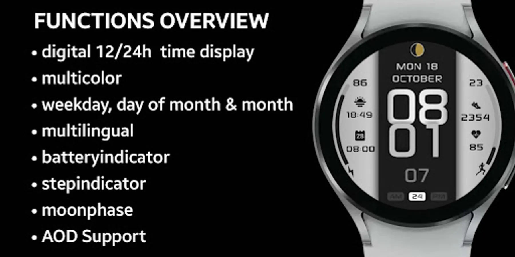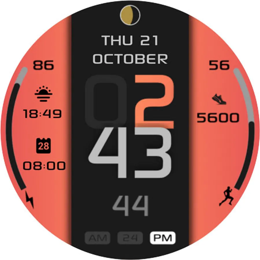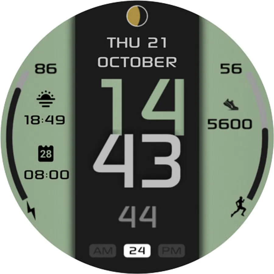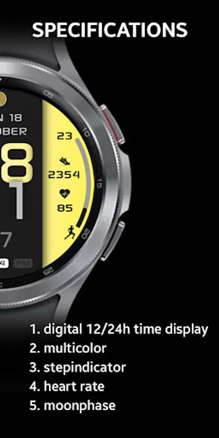 It contains 2 customizable App shortcuts and 2 customizable field, steps, moonphase, changeable colors and more..