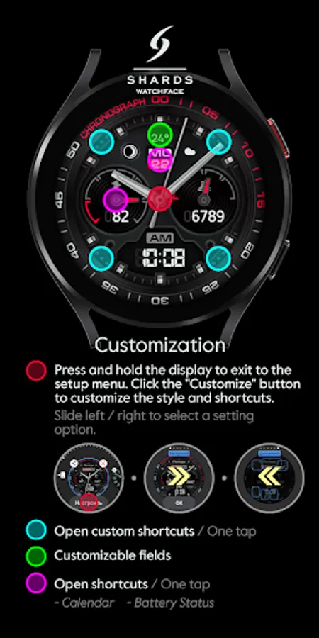 Shards is the perfect choice of watch faces for Wear OS smartwatches. Analog, digital, hybrid watch faces for your watch.