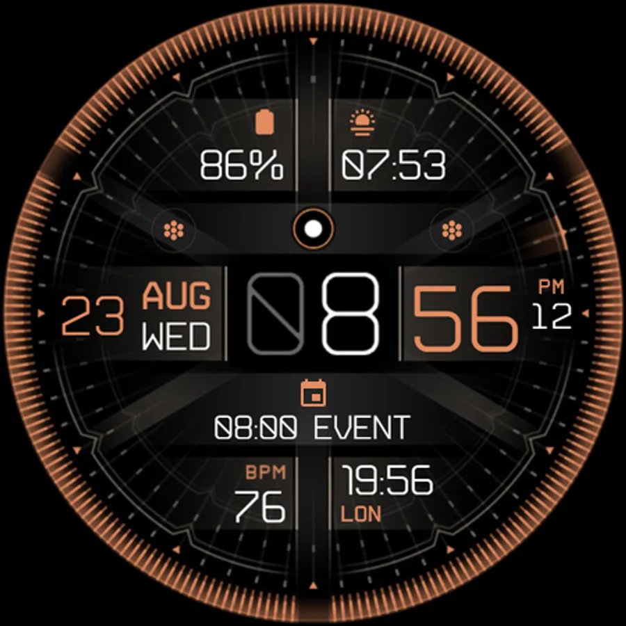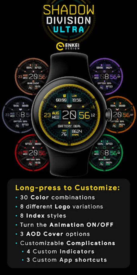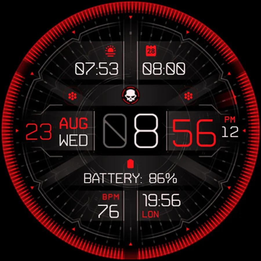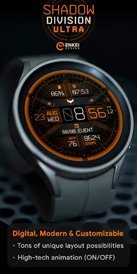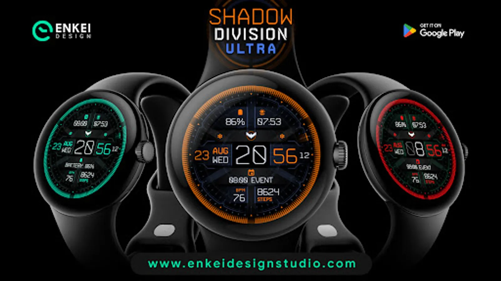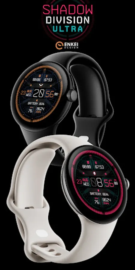 Shadow Division Ultra is a high-tech digital watch face with a futuristic interface, and tons of customization options!