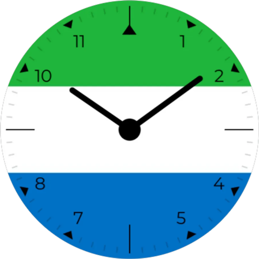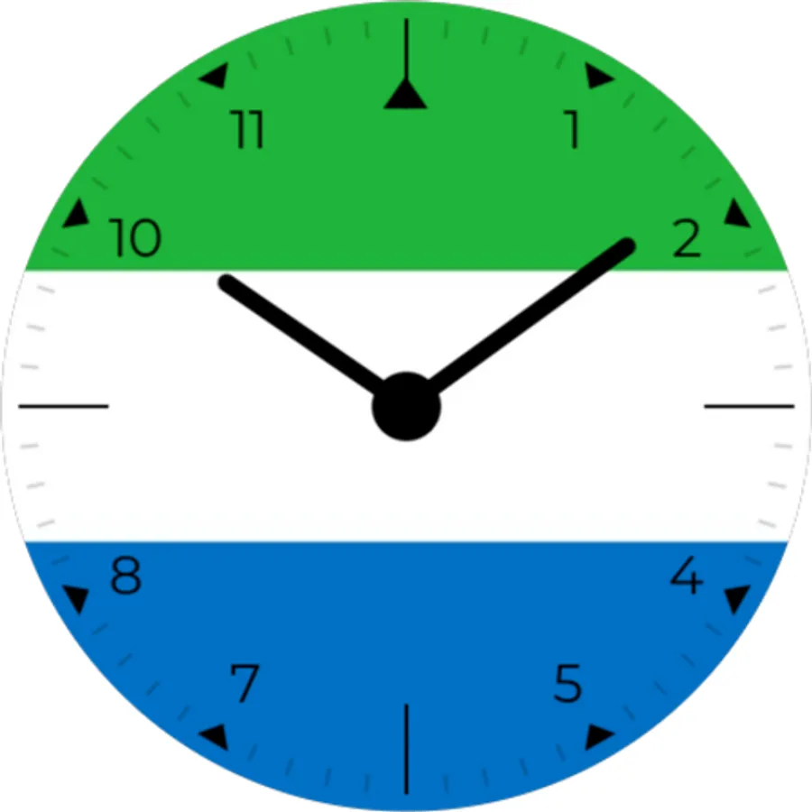 Analog watch face with Sierra Leone flag in background. Show the pride in your nation with a sleek, modern watch face with your countries national flag. Always on display simple white on black for longer battery life.