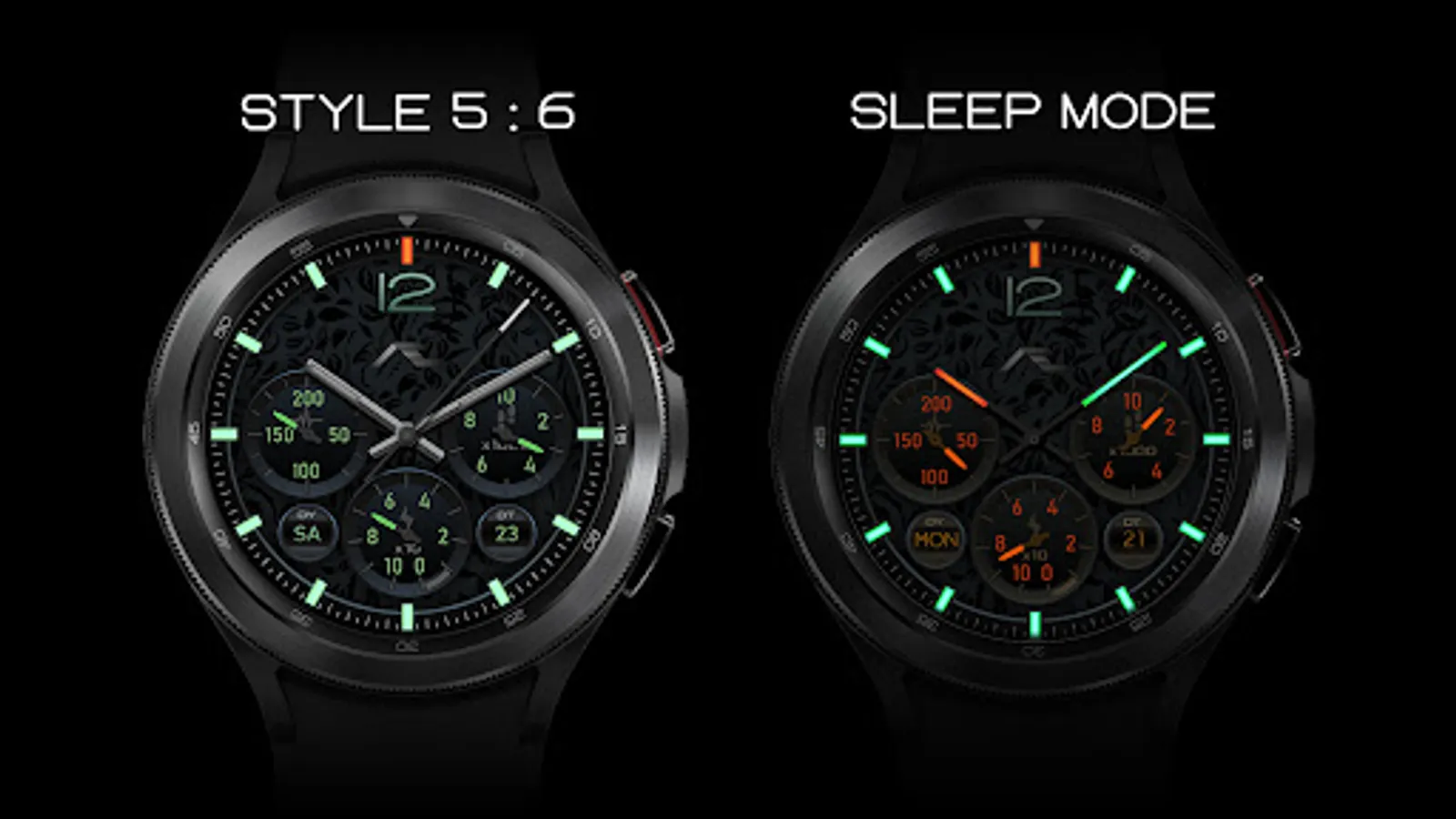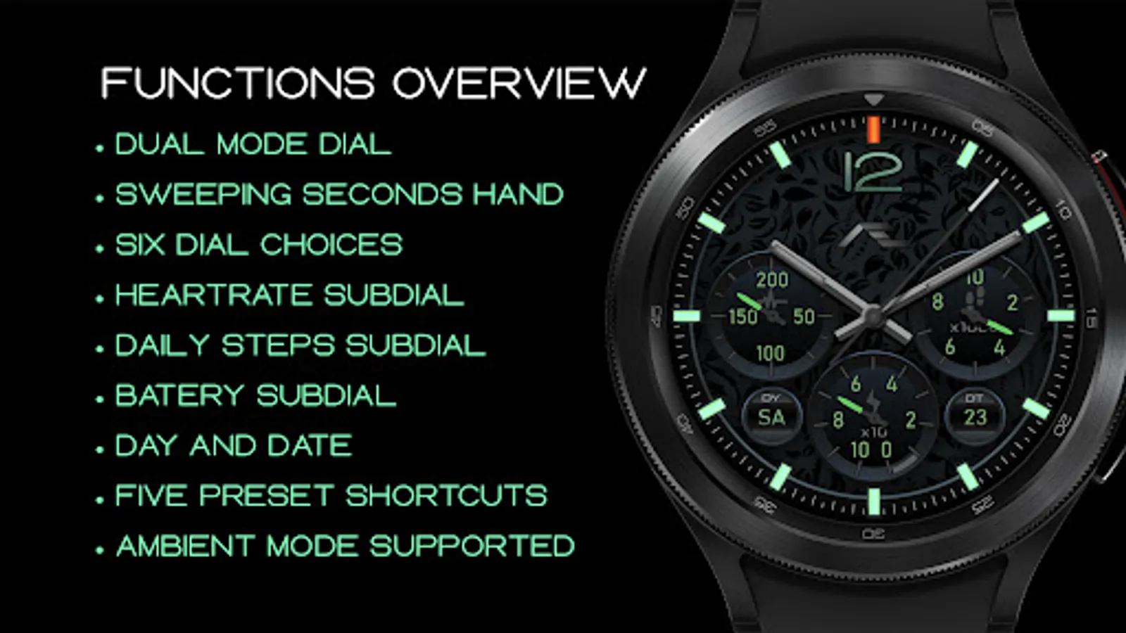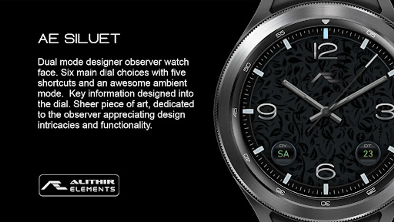 Dual mode designer observer watch face. Six main dial choices with five shortcuts and an awesome ambient mode. Key information designed into the dial. Sheer piece of art, dedicated to the observer appreciating design intricacies and functionality.