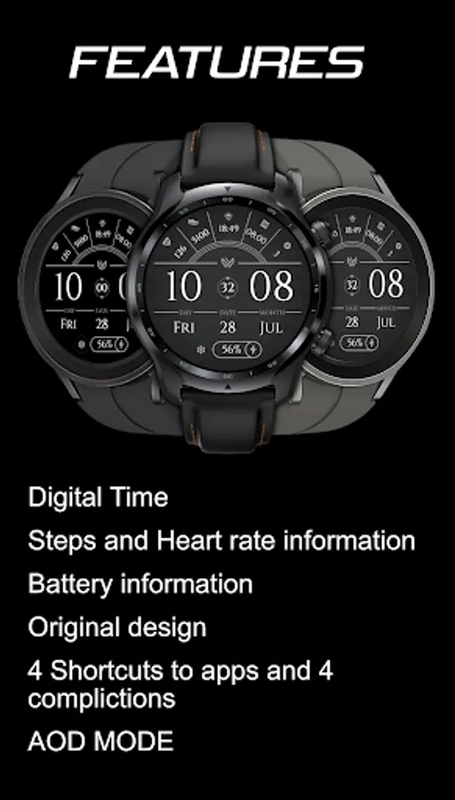 Note: This watch face supports all Wear OS devices with API Level 28+