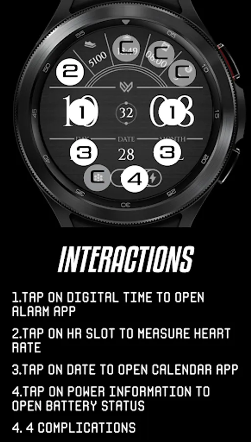8 interactions (1.Tap on week or date to open calendar, 2.Tap on HR slot to measure Heart Rate, 3.Tap on battery slot to open Battery status, 4.Tap on time to open alarm app, 5. customizable complications (see screenshots provided for reference))